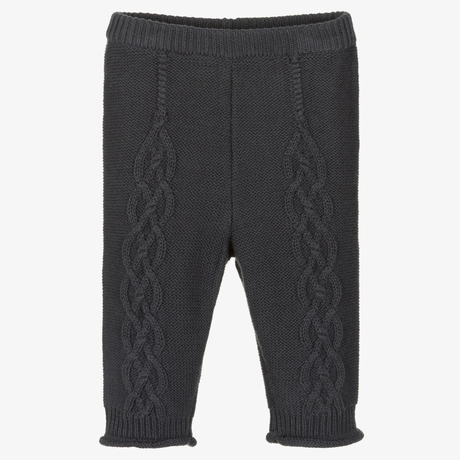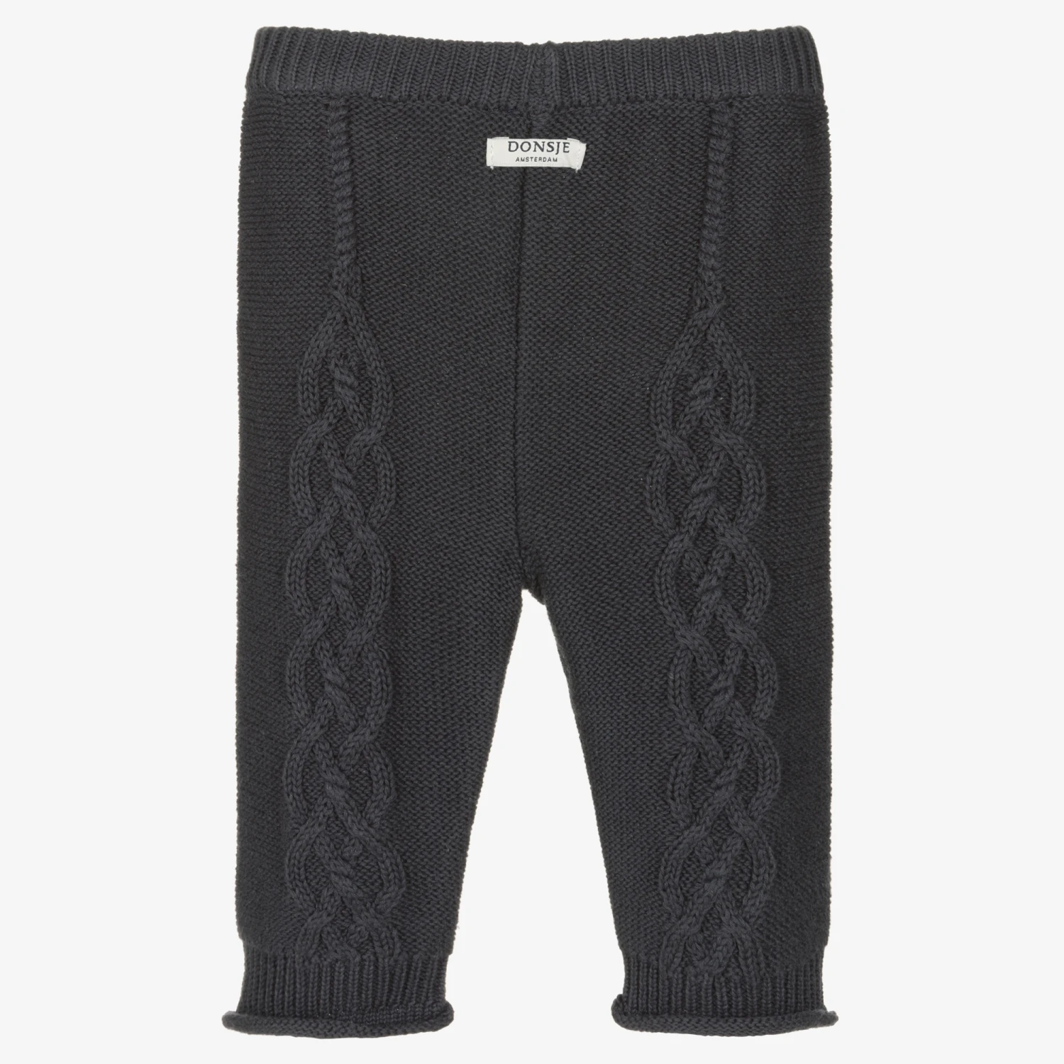 Handmade cute navy blue trousers for little boys and girls by Donsje, knitted in soft cotton. They have thick cable knit down each leg and the brand’s logo patch is on the back. The waist and ankles are ribbed to stretch when dressing and comfortable movement.