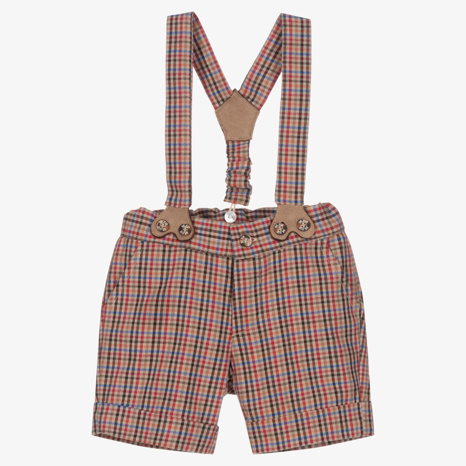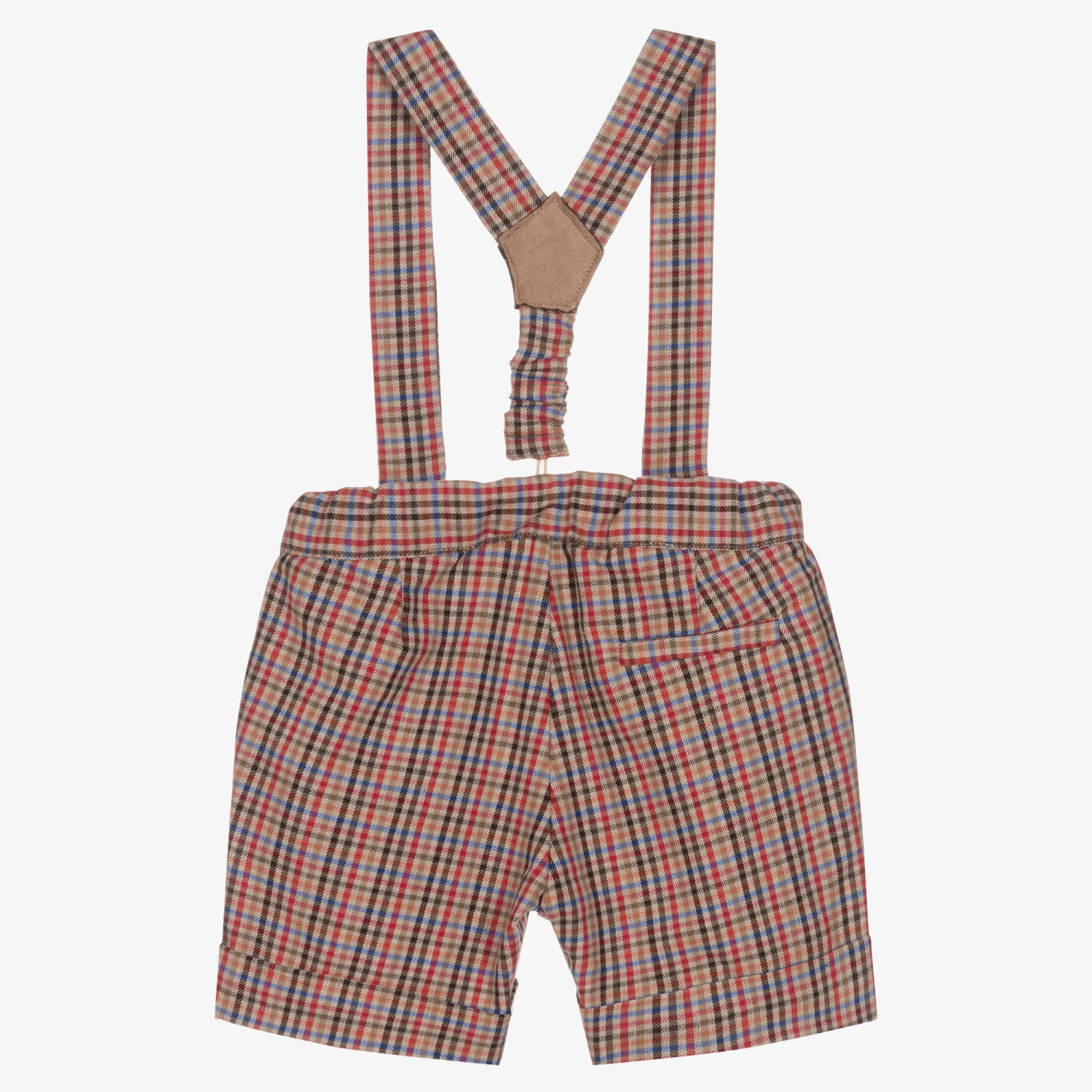 Beige, red and blue check shorts for little boys by Portuguese brand Dr. Kid. Made in cotton twill, they have front pockets, one back pocket and turn-up cuffs. The detachable braces are secured with logo buttons, have faux suede trims and are elasticated around the back for a comfortable fit. The adjustable waistband fastens with a button.