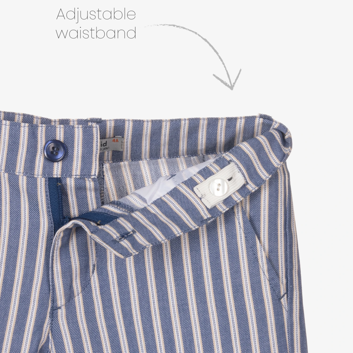 In a blue, beige and white stripe, these smart-casual trousers for boys are by Dr. Kid. Woven in lightweight cotton, they fasten with a zip and button on the front, and have an adjustable waistband for a comfortable fit. There are slanted pockets at the hips, with an additional slip pocket on the back.