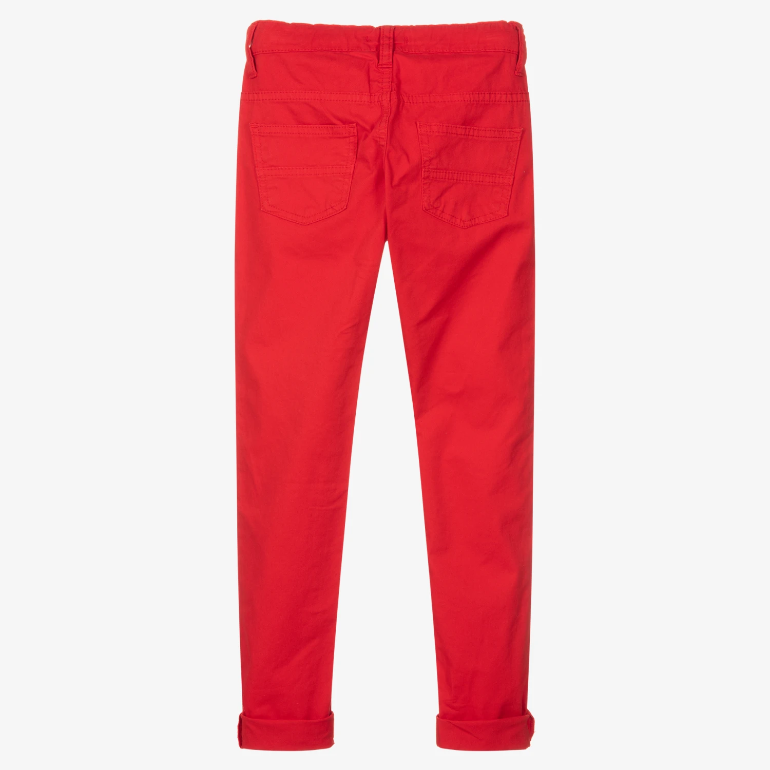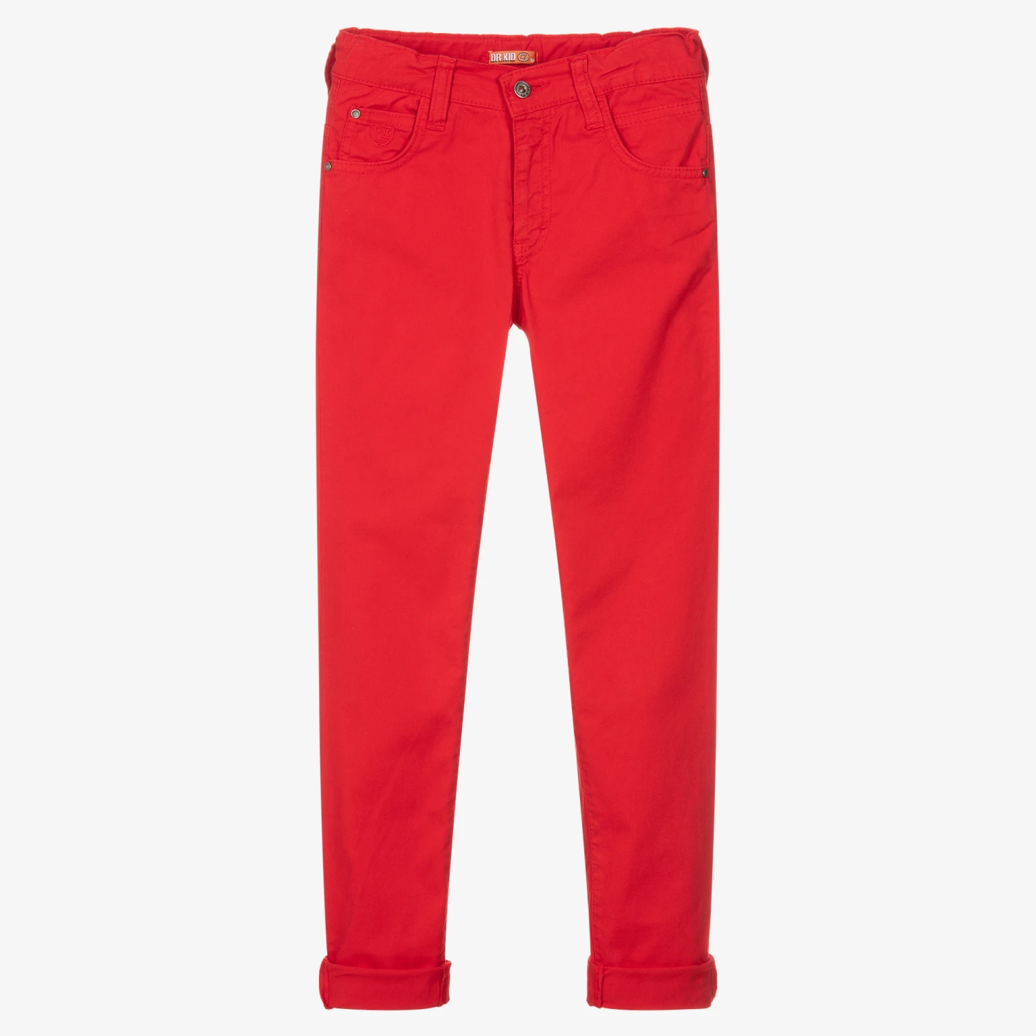 Red trousers for boys by Portuguese brand Dr. Kid, made in soft and lightweight twill with a slight stretch. Comfortable to wear, they have a button and zip fastening, classic five-pocket styling, and an adjustable waist to ensure a good fit. There is a tonal embroidered logo on the coin pocket, for a subtle designer finish.
