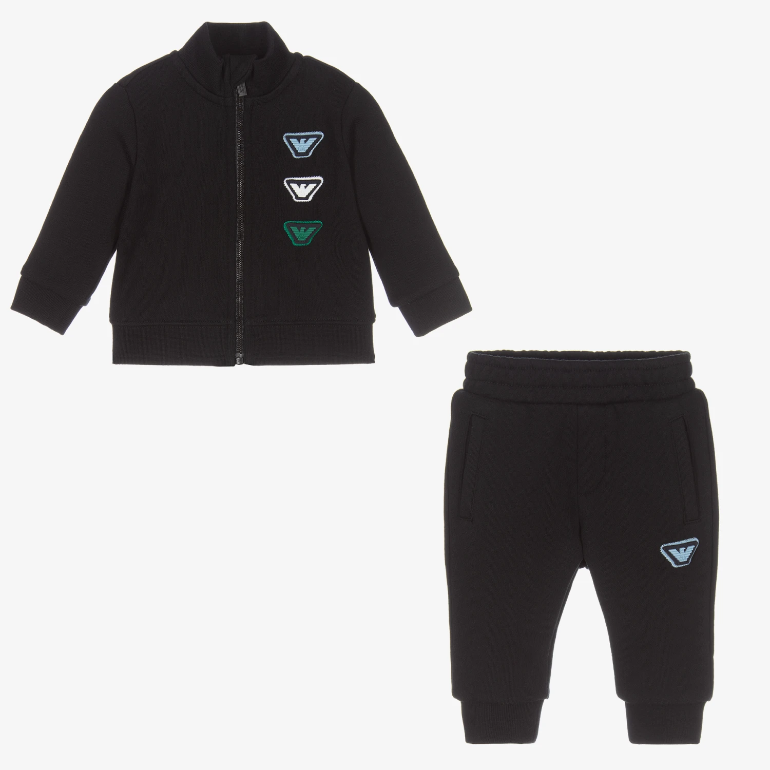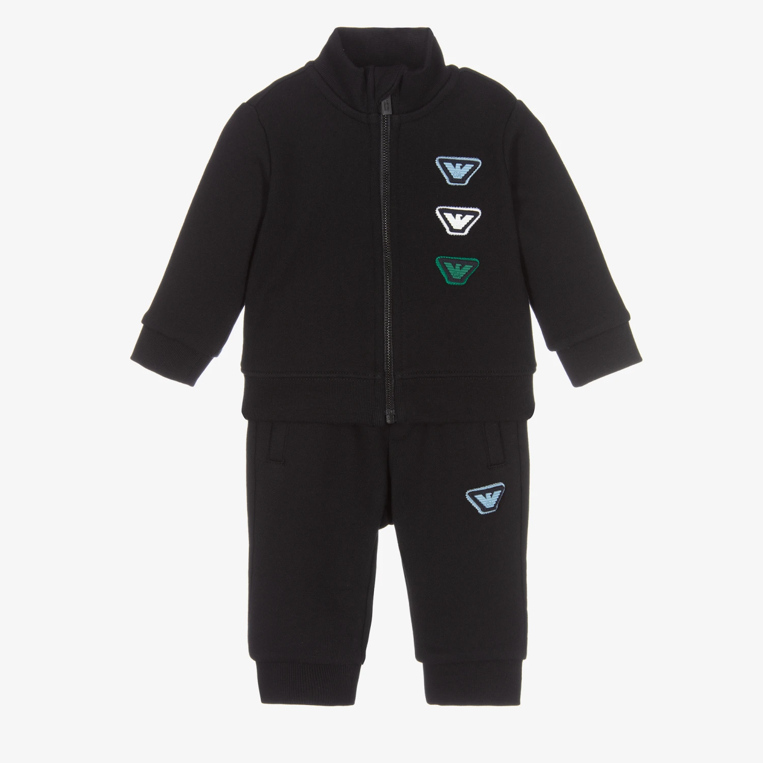 Dark navy blue tracksuit for baby boys from Emporio Armani, made in soft organic cotton jersey. The zip-up top has a stand-up collar with chin guard and rubberised Eagle logo patches in blue, white and green. The joggers have a matching rubberised logo in blue, side pockets, and a faux pocket on the back.