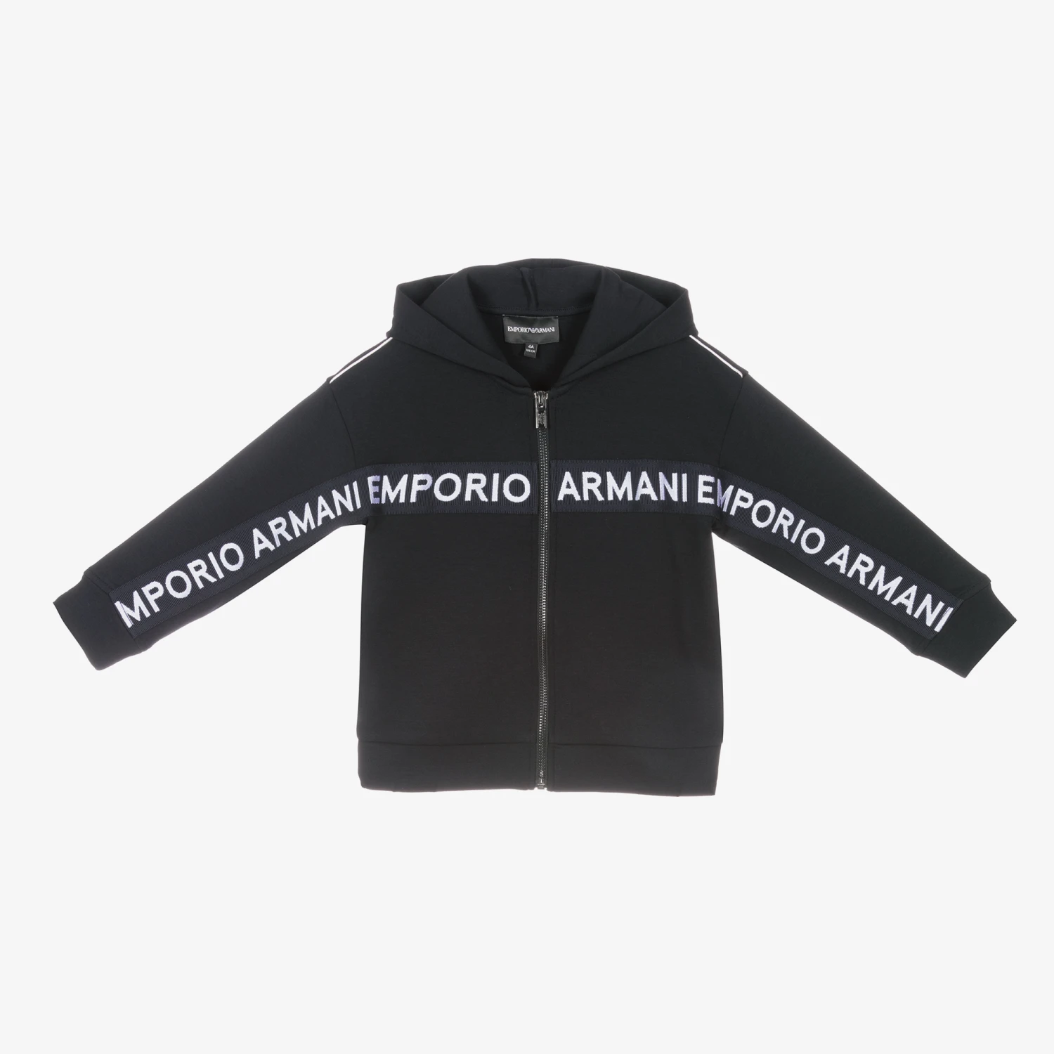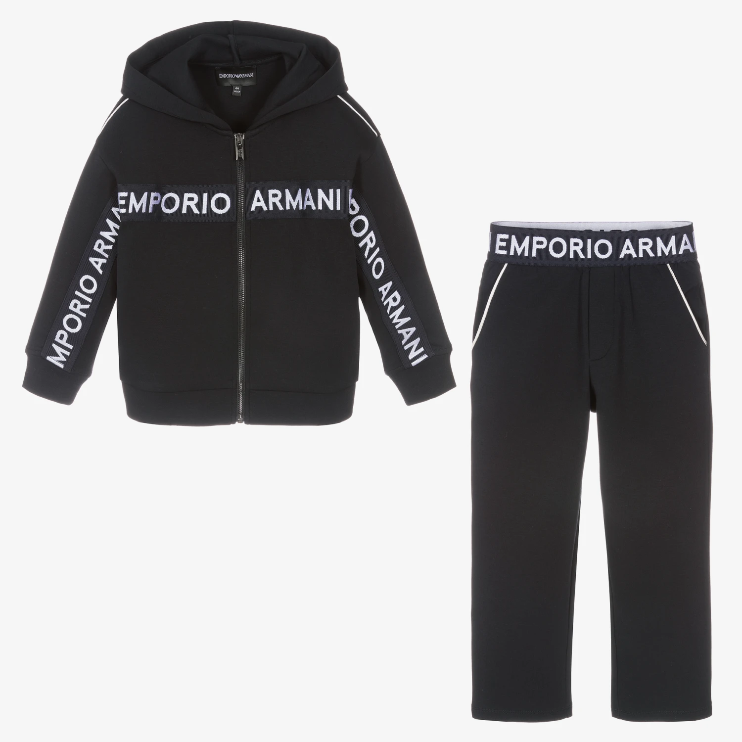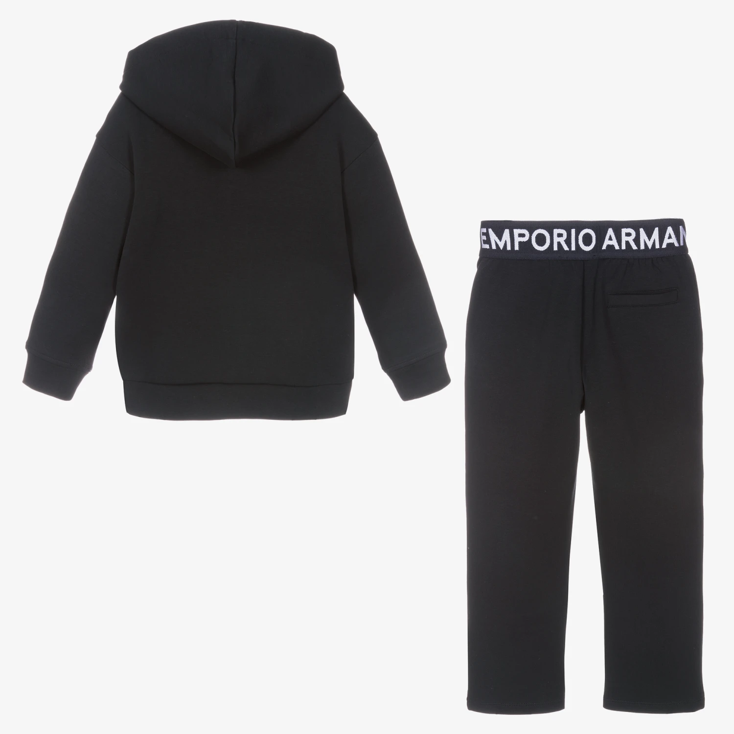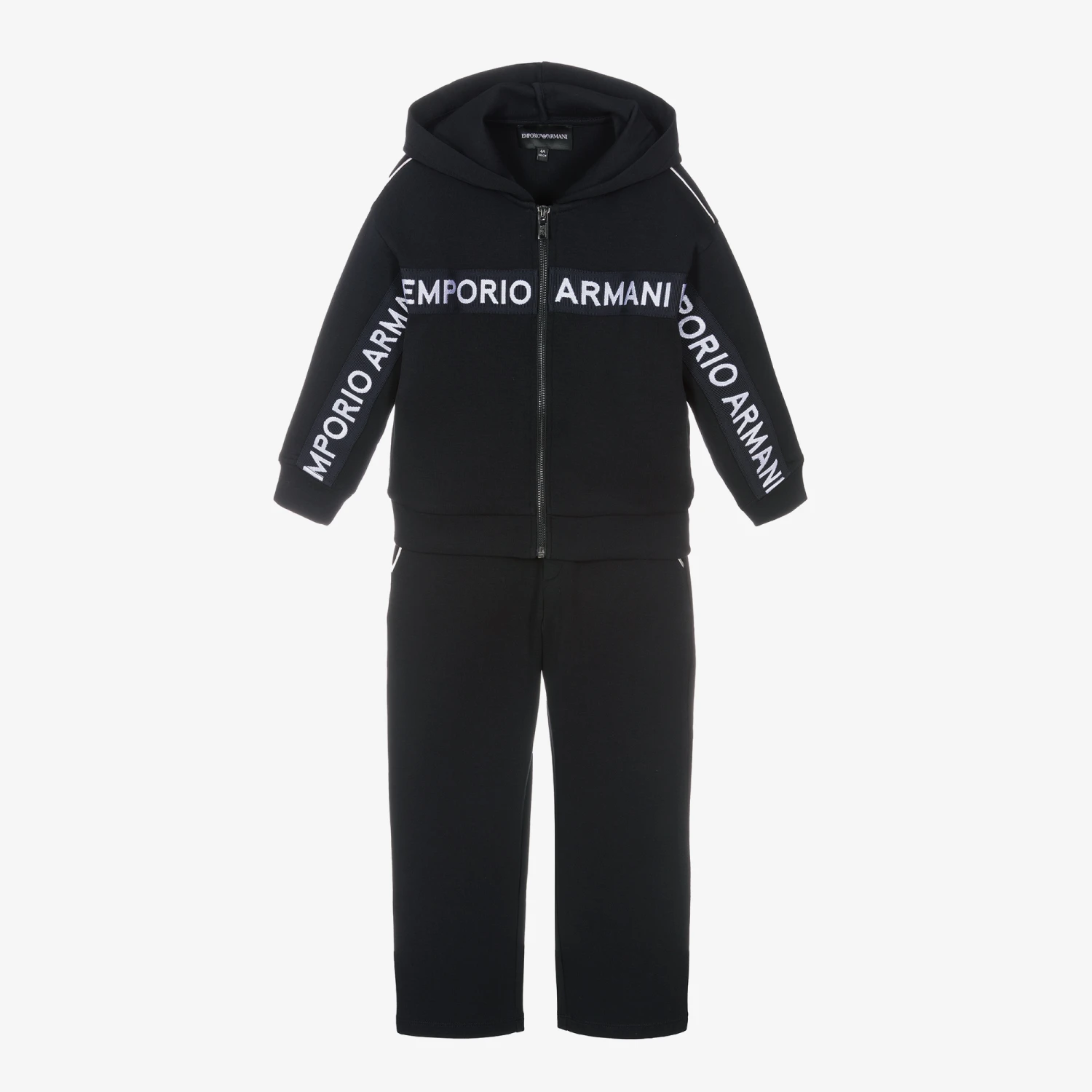 Navy blue cotton blend hooded tracksuit for boys by Italian designer Emporio Armani, with bold navy blue and silver logo tape detailing and silver piping. Made in soft, comfortable, lightweight jersey, the top has a logo pull tab on the zip fastening and useful concealed side pockets. The joggers have jetted front pockets and a comfortable, elasticated waistband,