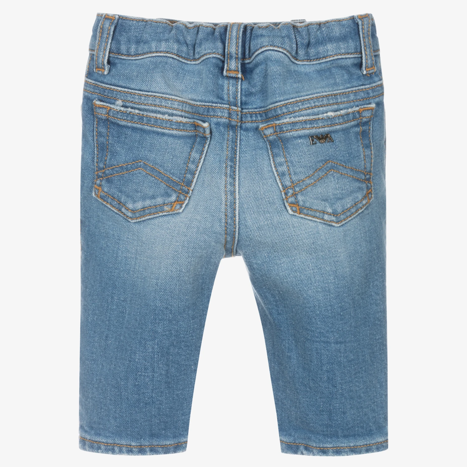 Washed blue jeans for little boys from Italian brand Emporio Armani, made in soft cotton denim. They have classic five pocket styling and a washed and worn look, with an elasticated waistband for ease. A branded stud on the front and the iconic Eagle logo plate on the back add a designer finish.