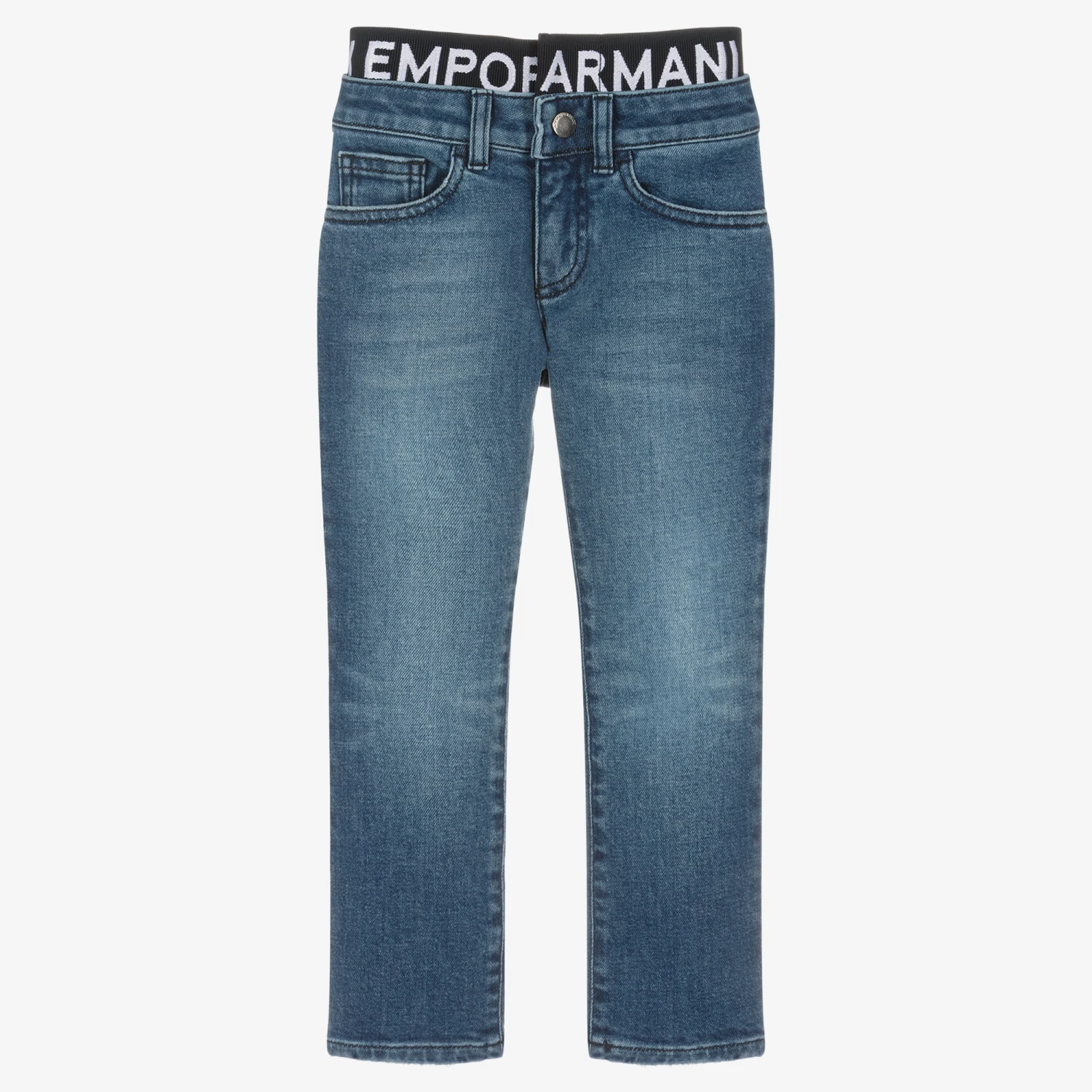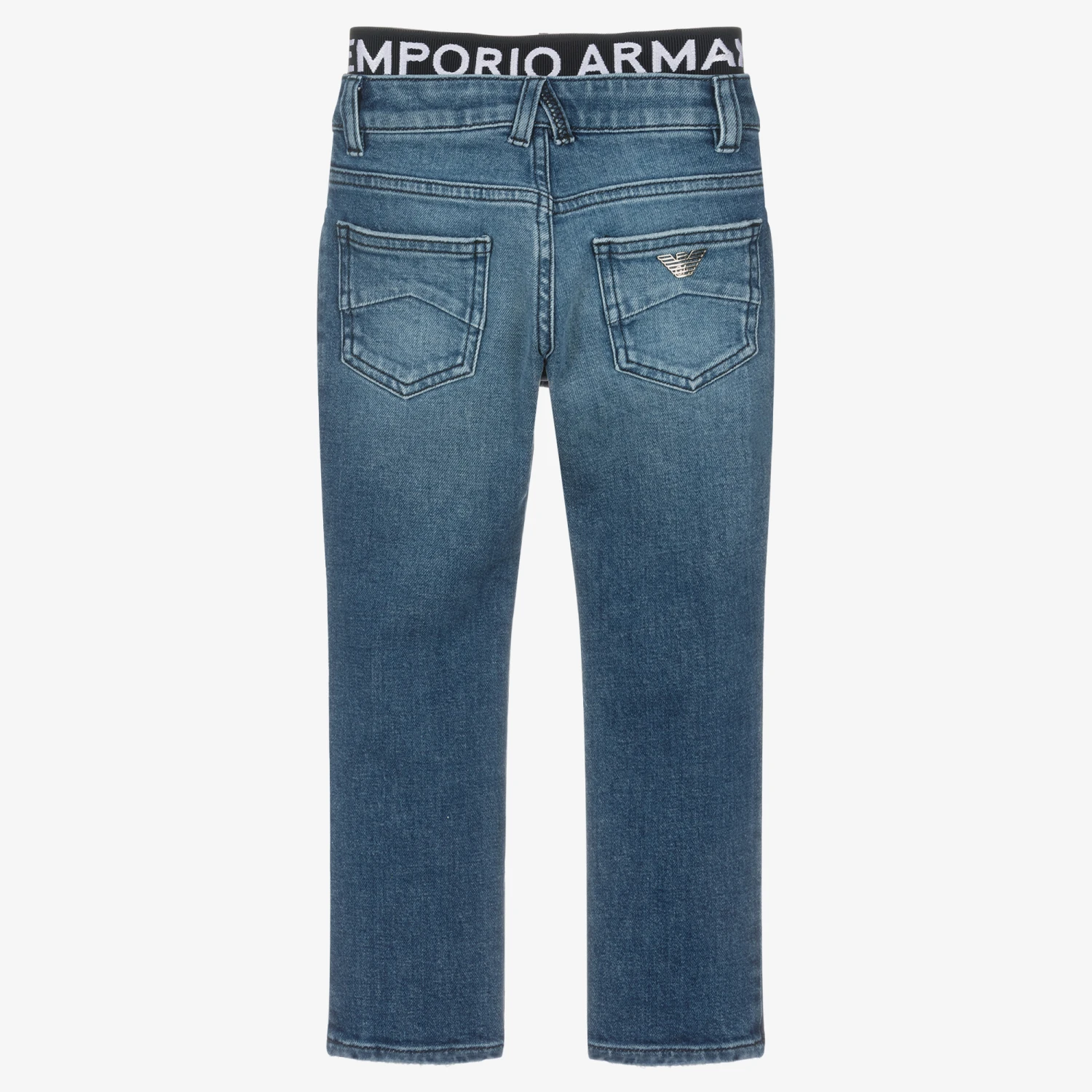 Mid-blue jeans for boys by Emporio Armani, made with an elasticated, jacquard logo insert on the waist. Made in soft, comfortable, stretchy denim, they have a washed and worn look, with distressed cuffs and five-pocket styling. They fasten with a branded popper and zip and are finished with an Eagle metal logo plate on the back for extra designer style.
