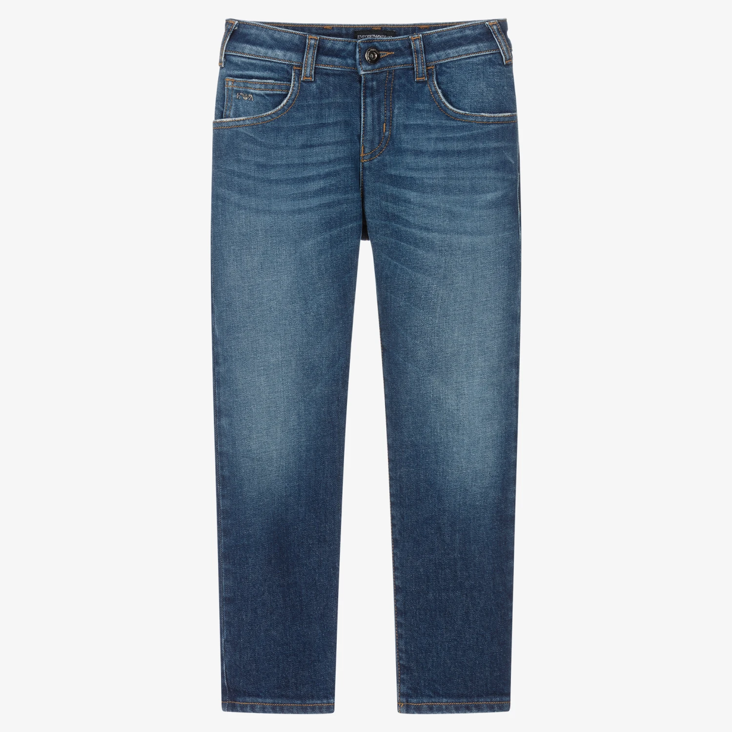 Stylish blue jeans for boys by Emporio Armani, with faded detailing giving a contemporary look. Made in soft stretch denim, they have an adjustable waist for a comfortable fit. There is a metal logo plate on the front and a metal Eagle logo plate on the back. Adding an extra designer touch, they have a branded button and zip fastening.