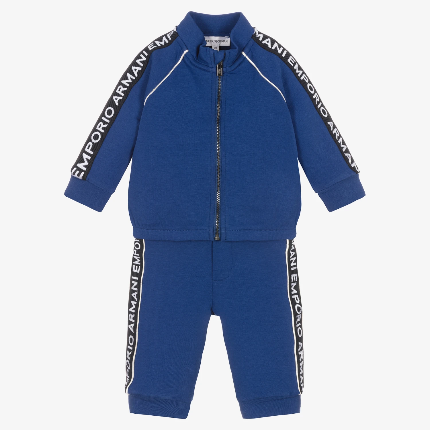 Stylish and comfortable for little boys, a cobalt blue tracksuit from Emporio Armani. Made in luxuriously soft, cotton-blend double jersey, both pieces have a navy blue and white embroidered logo trim and white piping detail. The top has a stand-up collar and branded zip fastener. The cuffed joggers have an elasticated waist for easy dressing.