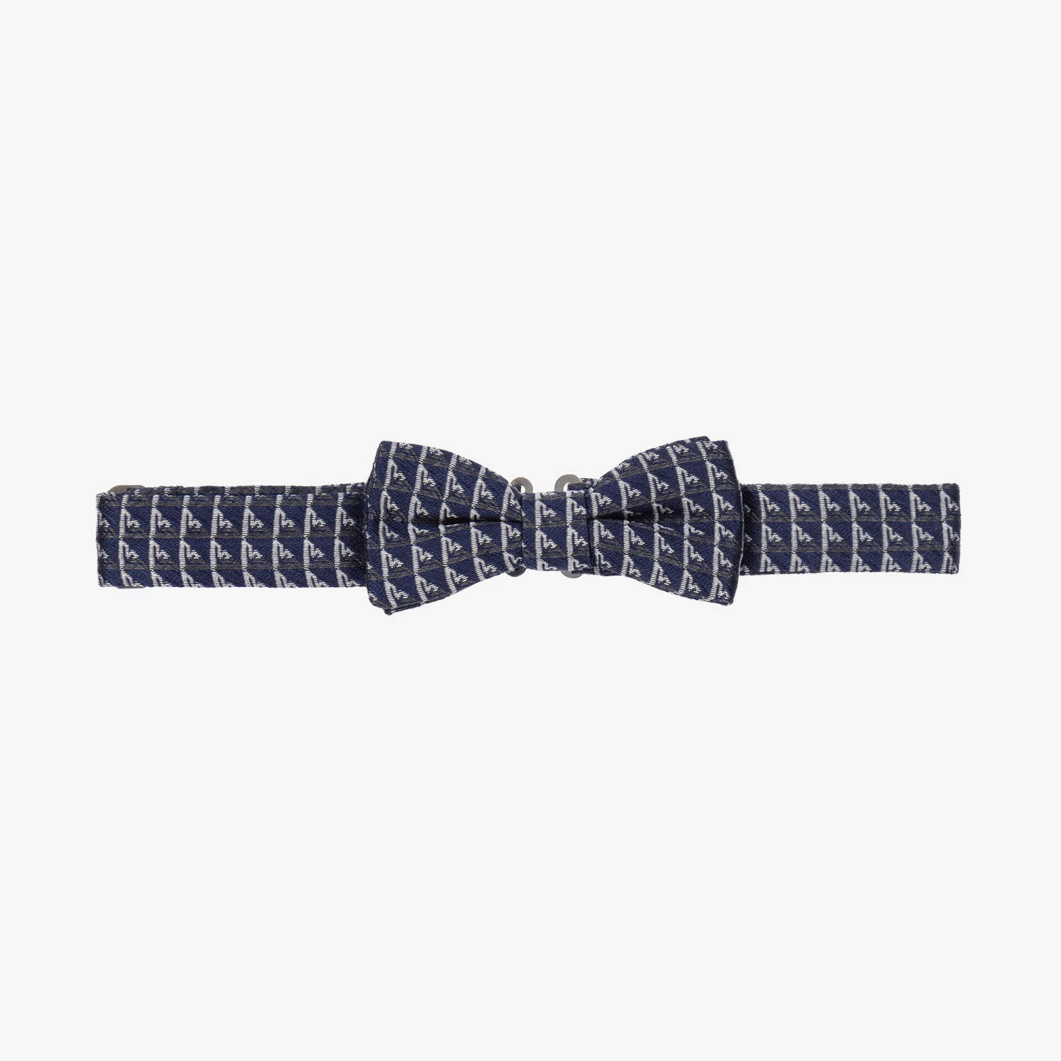 Navy blue bow tie for boys by Emporio Armani, made in soft, lightweight silk. It has a white and grey Eagle logo pattern and an adjustable strap, with a clip fastening.