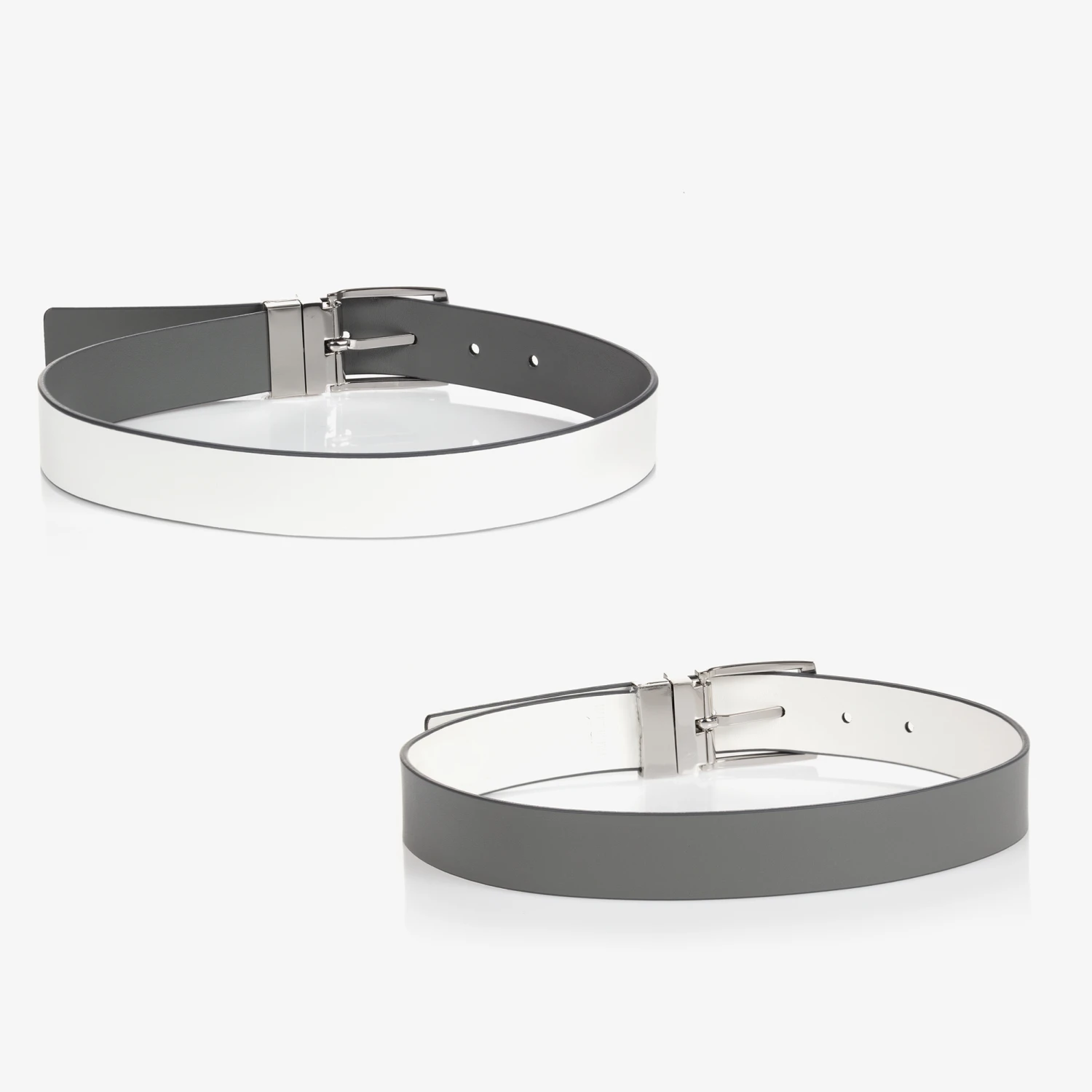 Boys grey and white reversible belt by Emporio Armani, made in soft faux leather. The logo branded metal buckle easily pulls out and twists around to offer two different colour ways.