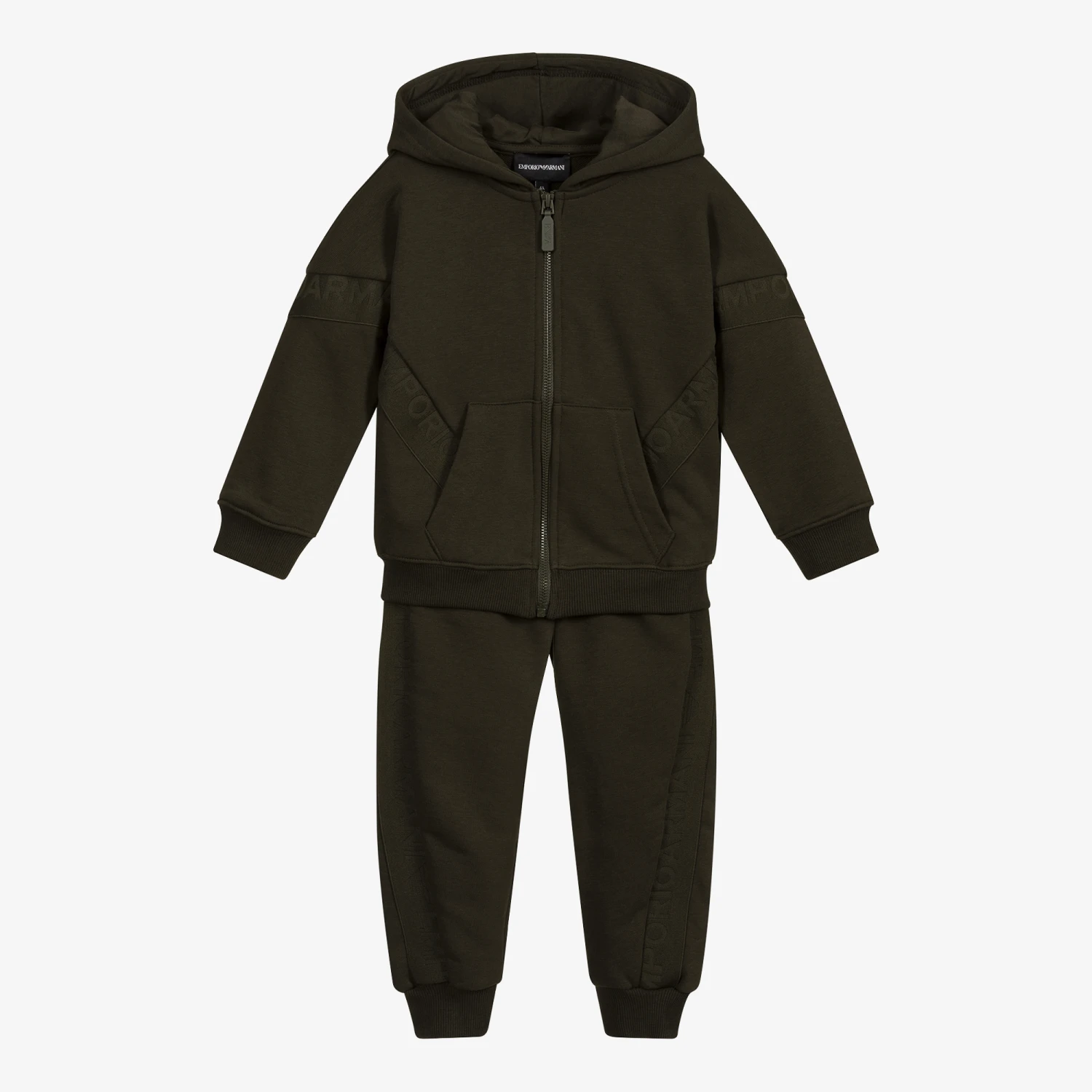 Khaki green hooded tracksuit for boys by Emporio Armani. Made in mid-weight cotton jersey with a fleecy inside, it has elasticated tape trims on both the top and joggers with the Emporio Armani and Eagle logos. The zip fastening on the top has an engraved logo pull tab and there are concealed side pockets on the joggers.