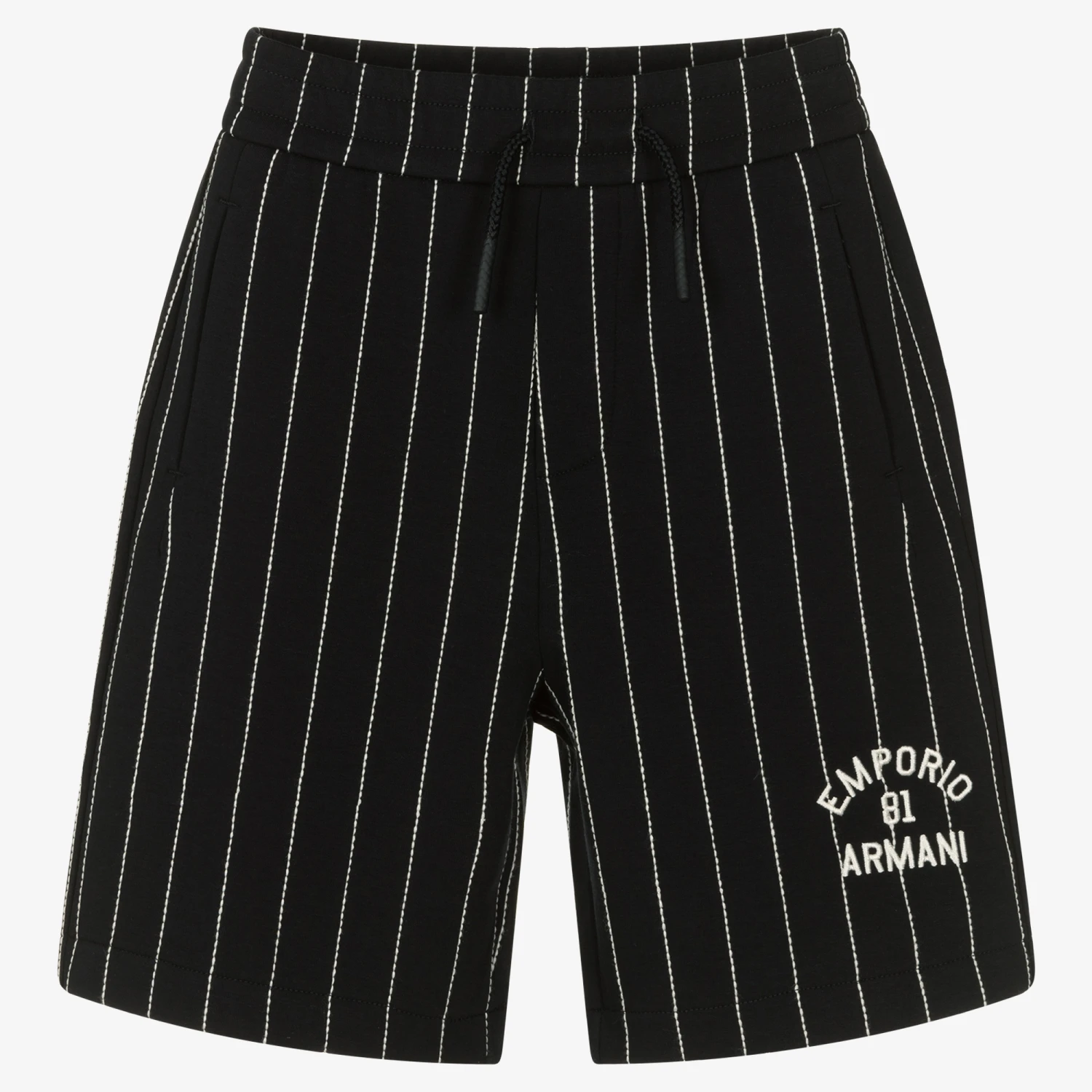 Boys dark navy blue cotton jersey shorts by Emporio Armani, with a white woven pin stripe pattern. Combining smart and casual effortlessly, these stylish shorts have a faux drawstring waist and concealed pockets. There is an embroidered white logo on one leg above the hem in a sporty varsity style.