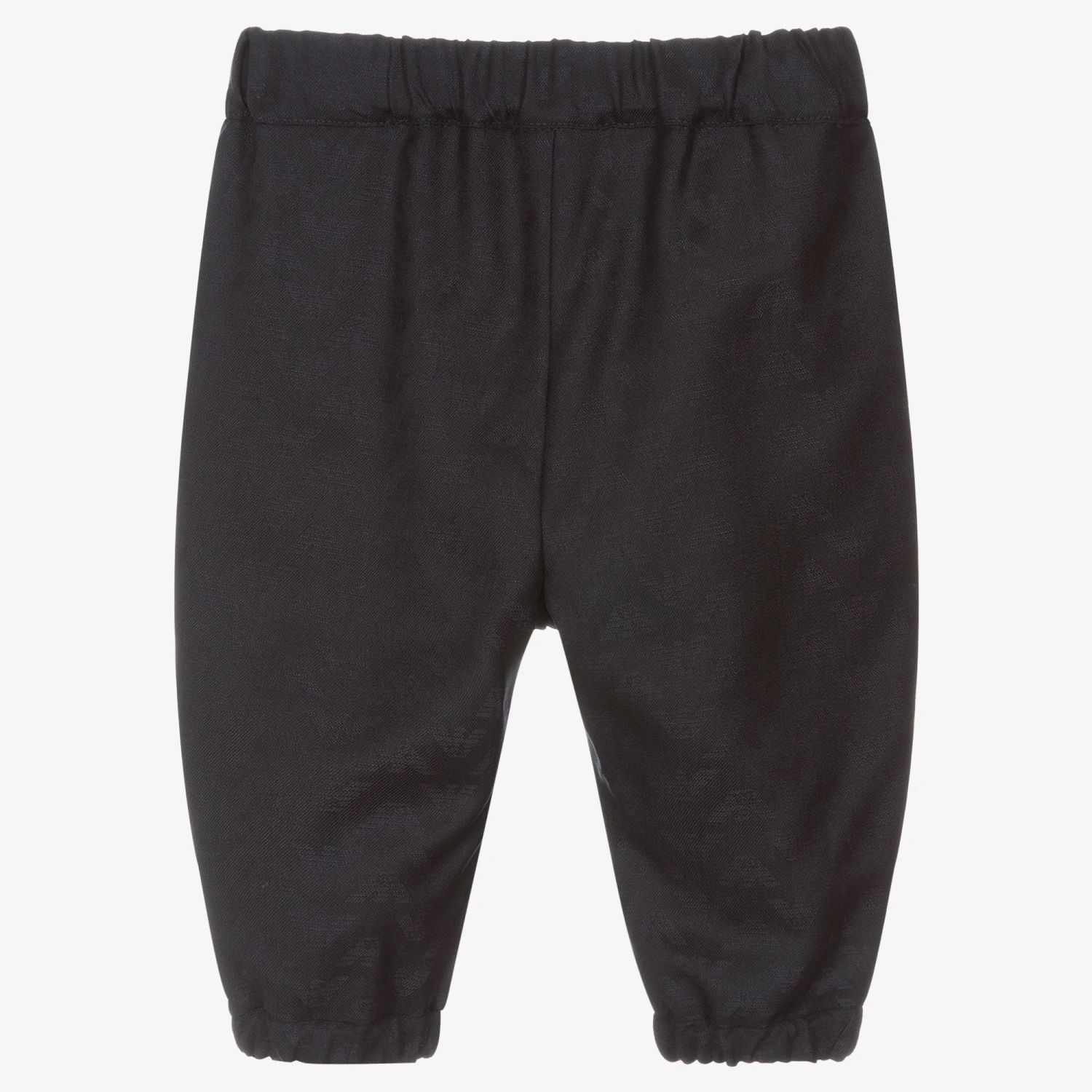 Smart for little boys, these navy blue trousers from Emporio Armani have been designed with a stylish cuffed ankle. Made in a luxurious wool and viscose blend, with a jacquard logo pattern, they have an elasticated waist for comfort and slanted front pockets. The designer’s iconic Eagle logo badge can be found on the front.