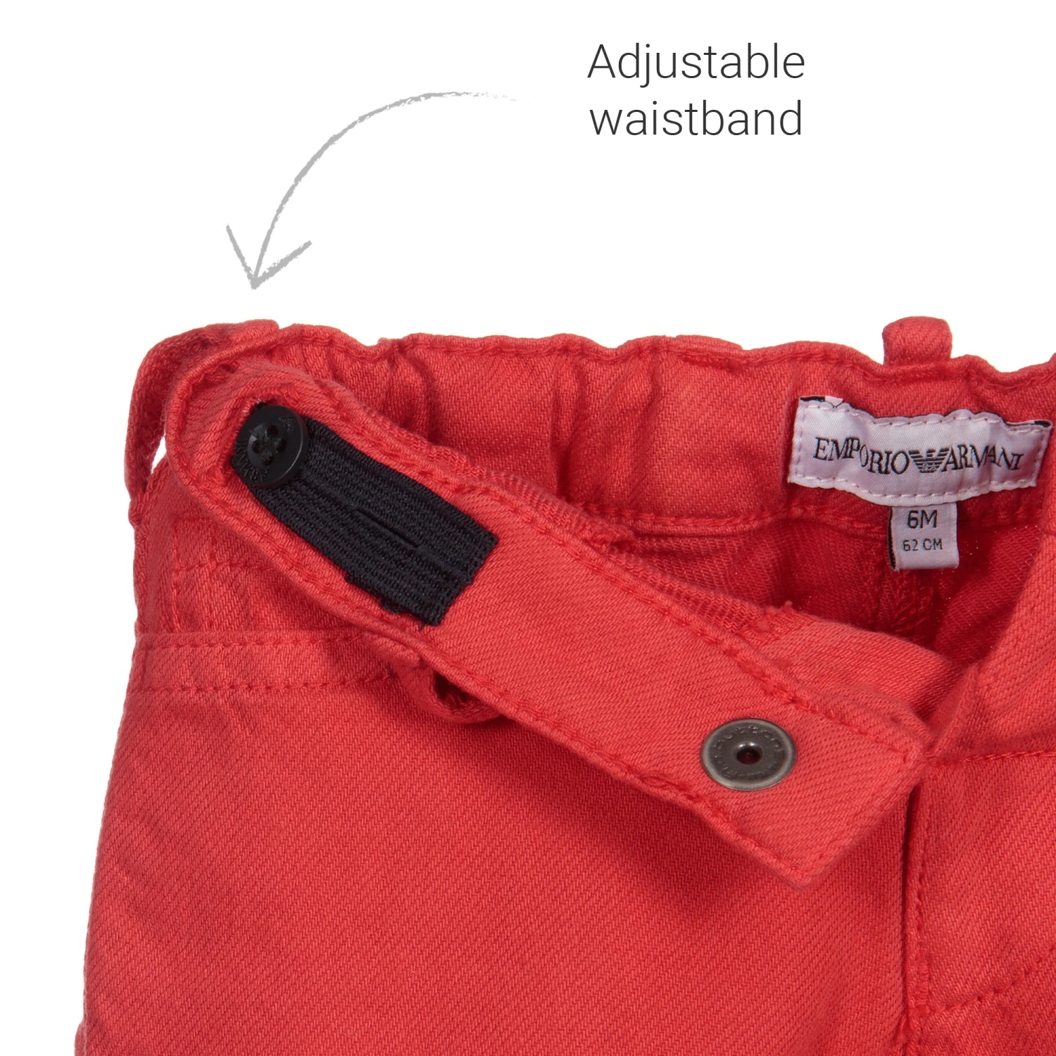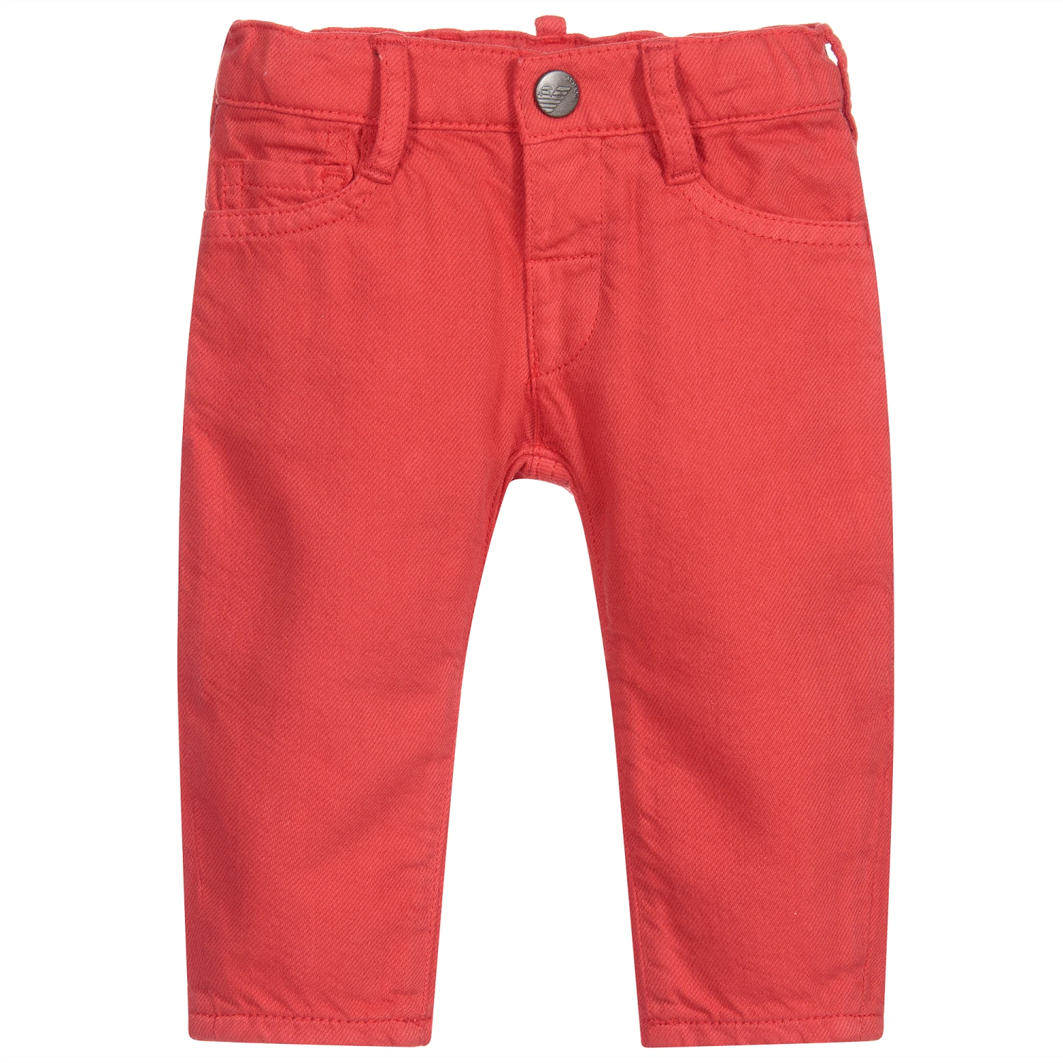 Red trousers for little boys by Emporio Armani, made in soft, brushed cotton twill. They have a classic five pocket design, with a popper fastening and a useful adjustable waistband. There is a metallic Emporio Armani logo badge on the back pocket.