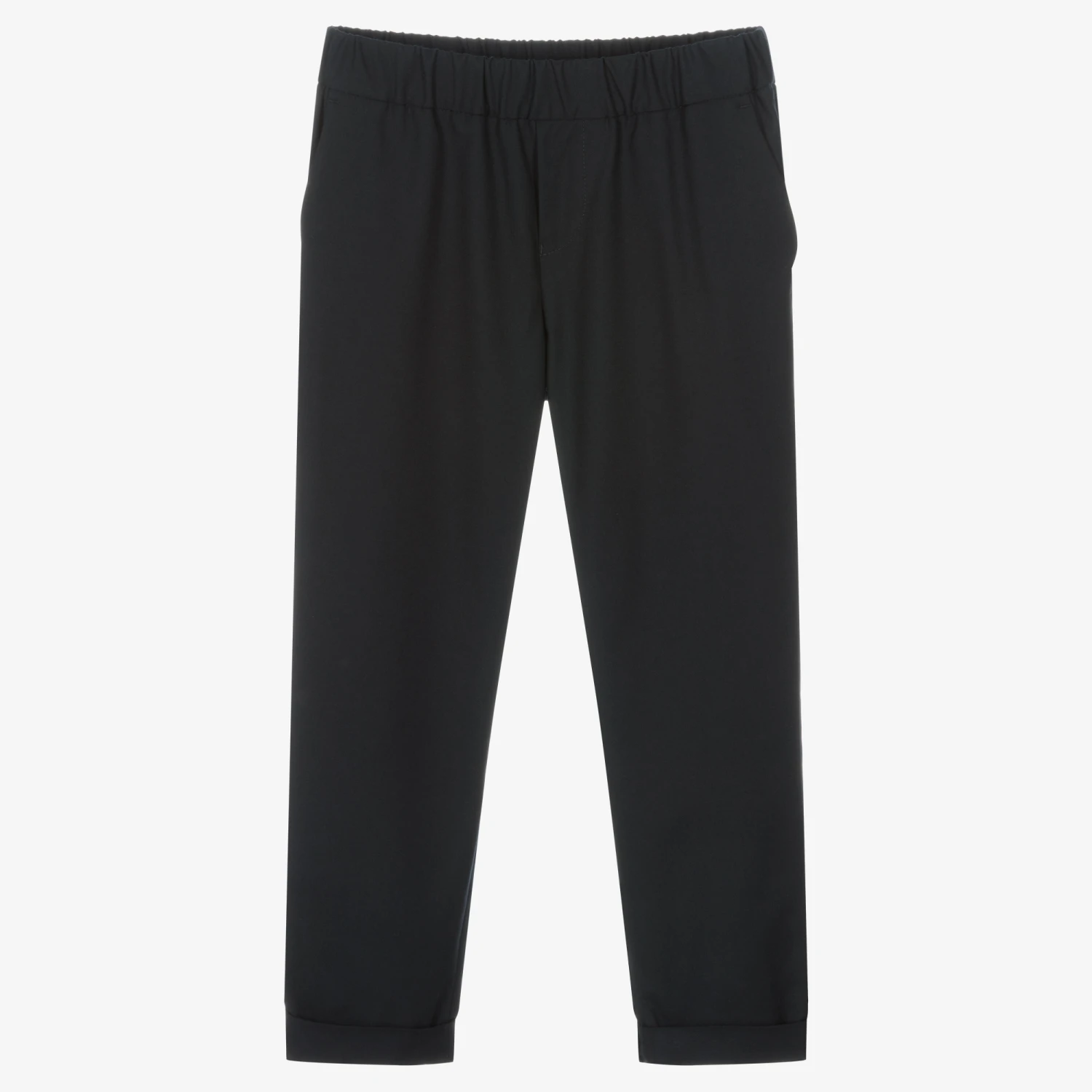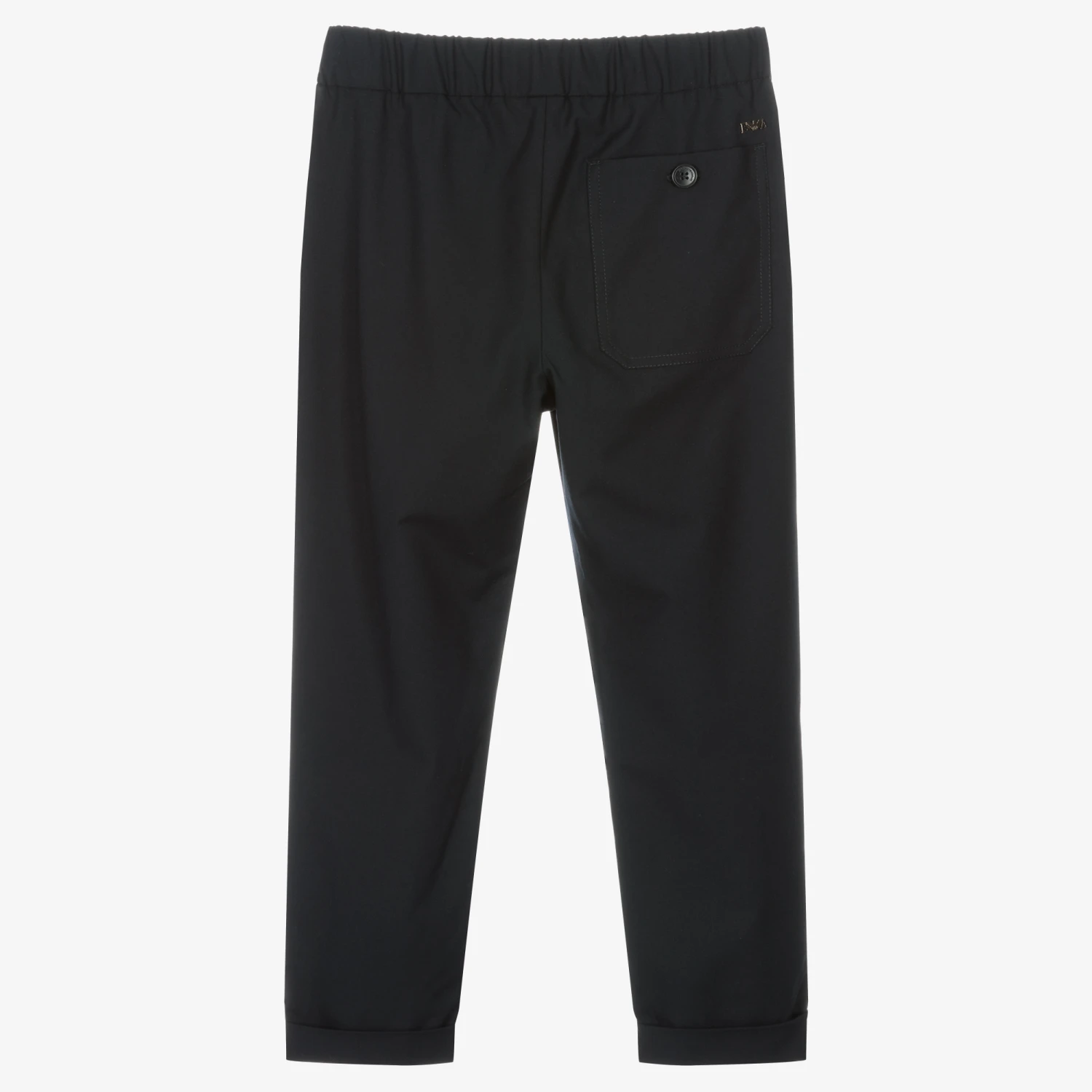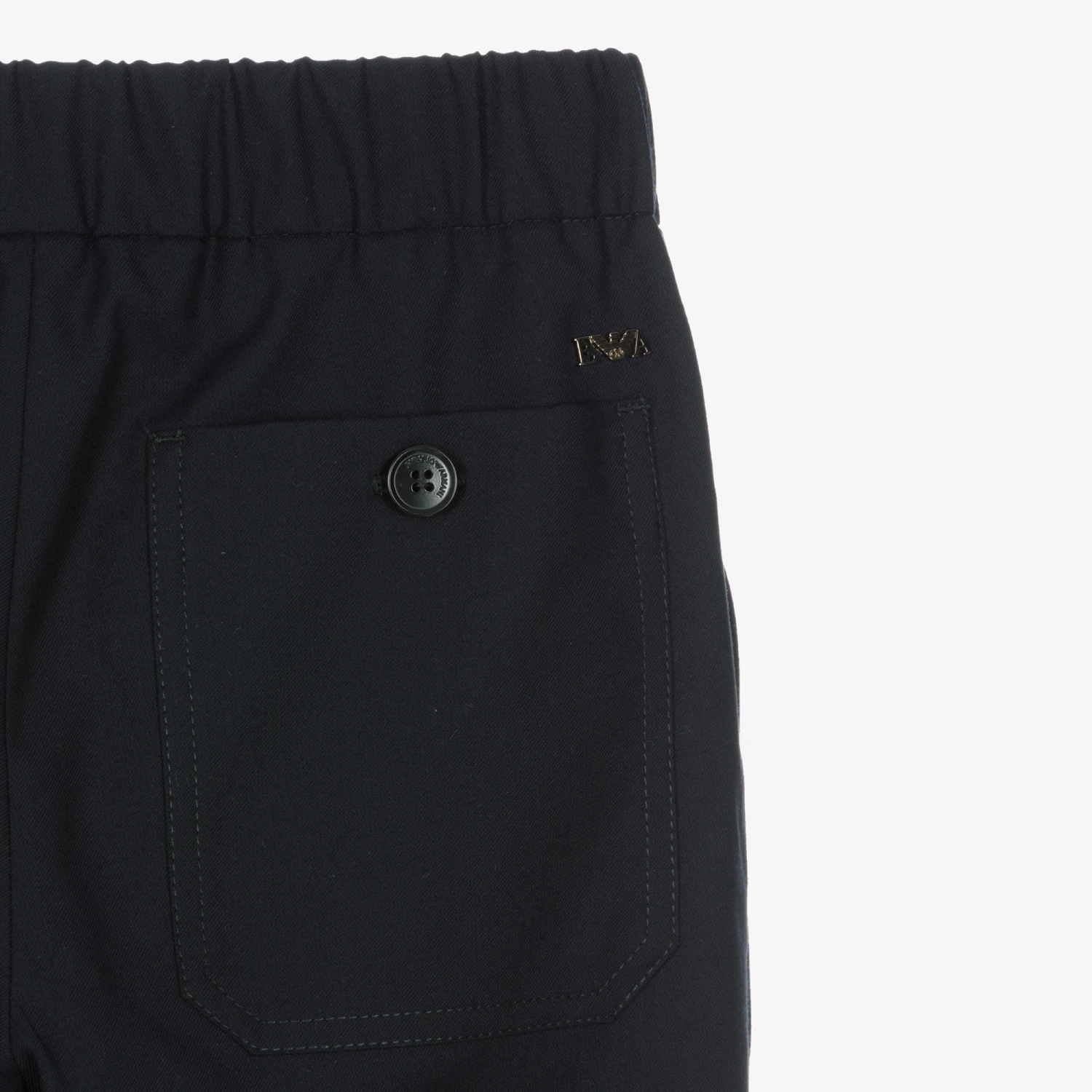 Smart navy blue trousers for boys by Emporio Armani, with an elasticated waistband for easy dressing. They are made in a soft viscose blend, with slanted front pockets, a button-fastening back pocket and turn-up cuffs. The brand’s silver metal logo badge is on the back.