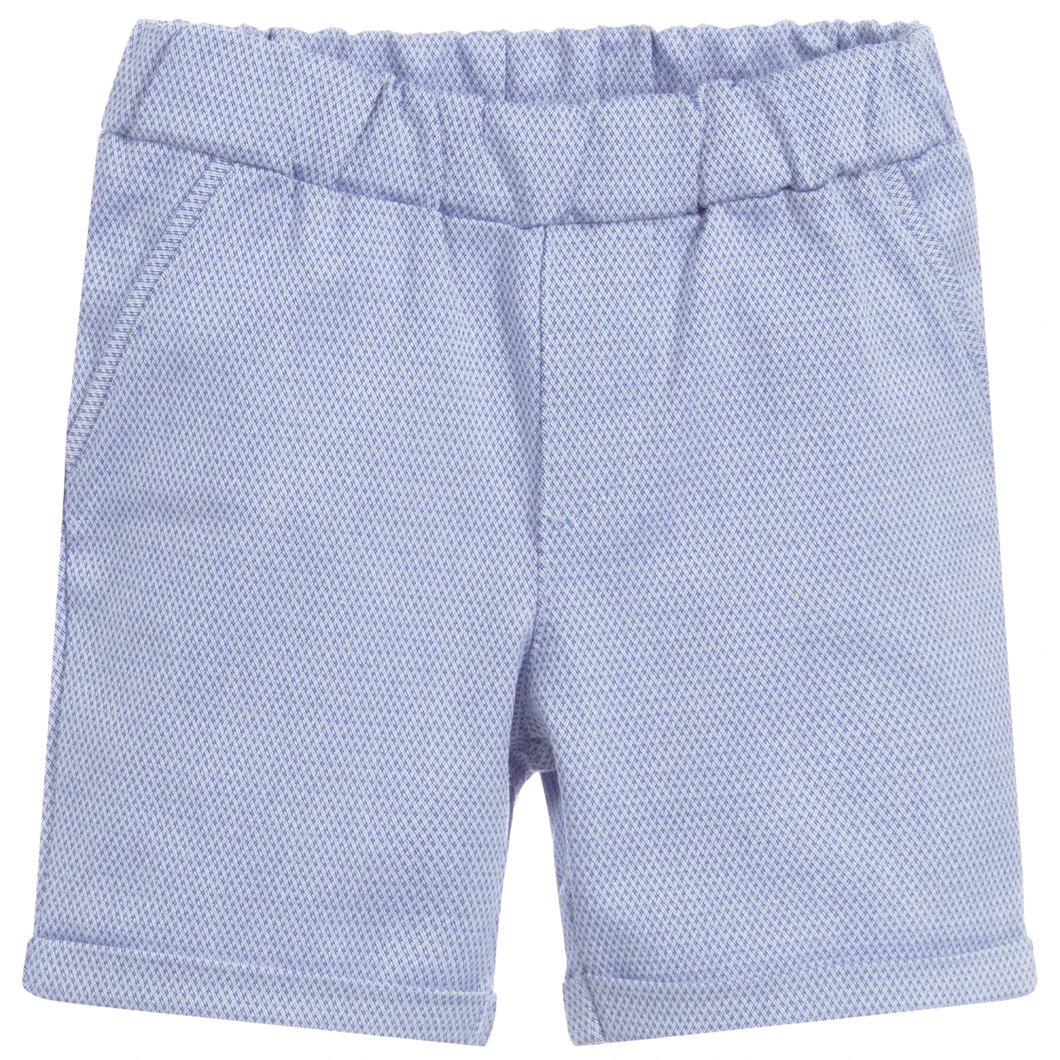 Baby boys blue shorts by Everything Must Change. Made in soft and stretchy, textured jersey, they have faux pockets and an elasticated waistband.