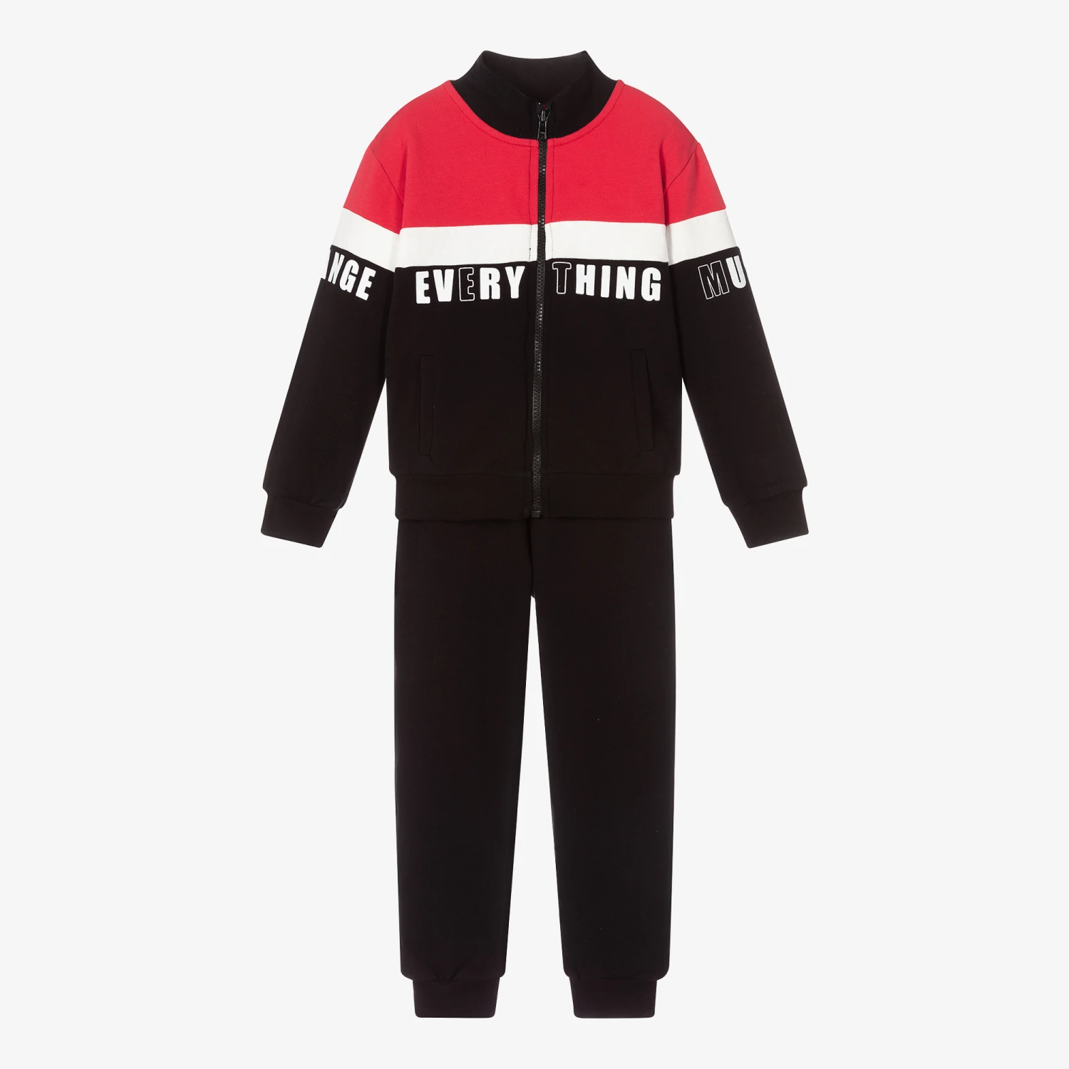Boys black, white and red tracksuit by Everything Must Change, made in mid-weight cotton jersey with a fleecy feel inside. The zip-up top has red and white inserts and a black and white logo print. It has ribbed trims and two useful pockets on the front. The joggers have a red drawstring on the elasticated waistband.