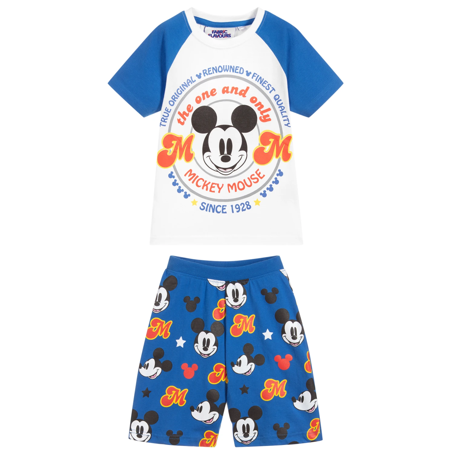 Exclusive to Childrensalon, these short pyjamas by Fabric Flavours are suitable for both boys and girls. Made in cotton jersey, the white top has blue raglan sleeves and Disney’s Mickey Mouse printed on the front in black, red and blue. The blue shorts have a fun, matching Mickey Mouse print.