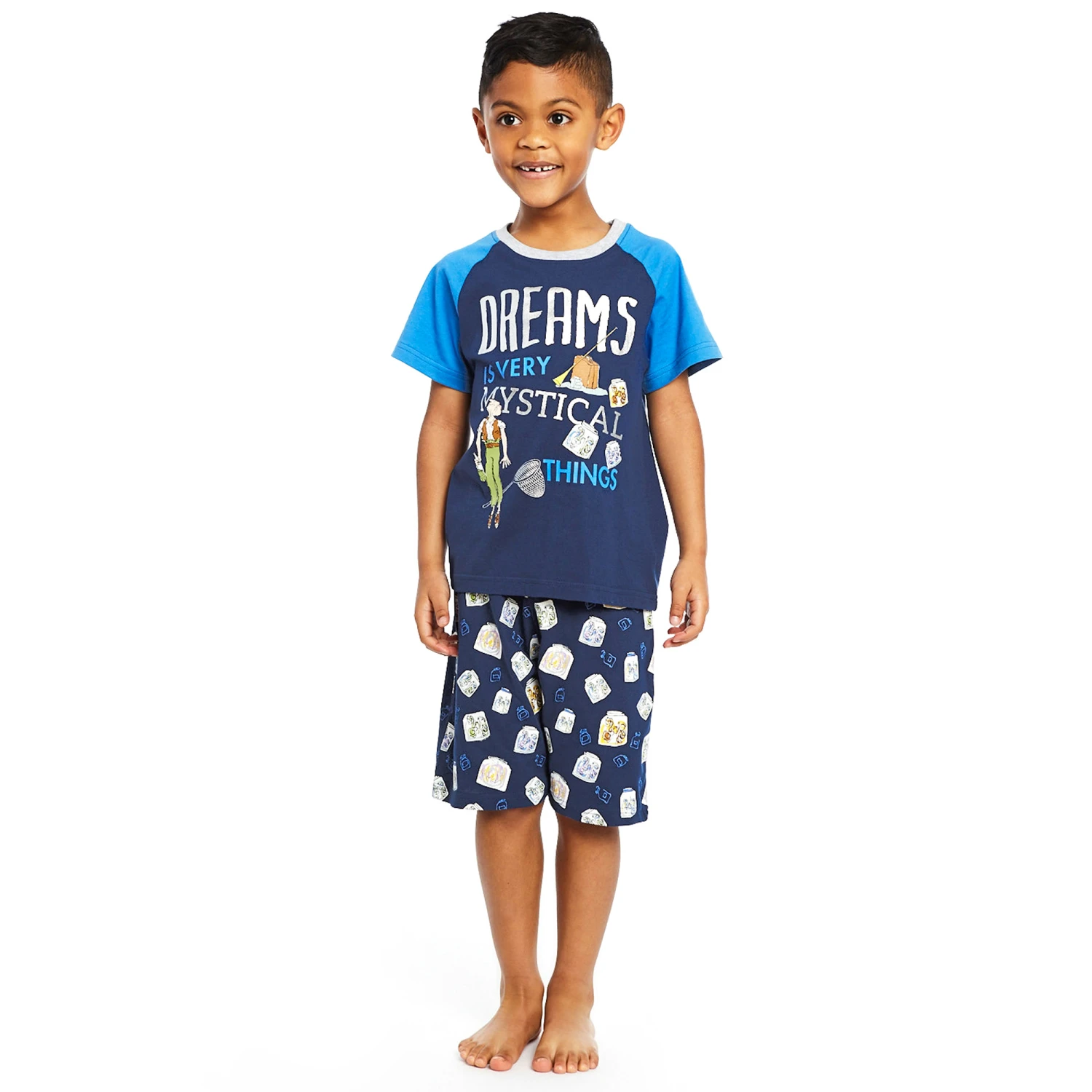 A fun pair of blue cotton jersey pyjamas for boys by Fabric Flavours, with a fun BFG (Big Friendly Giant) Roald Dahl© print. Soft and stretchy, the shorts have a comfortable grey jersey waistband. The T-shirt has bright blue sleeves and a metallic silver logo.