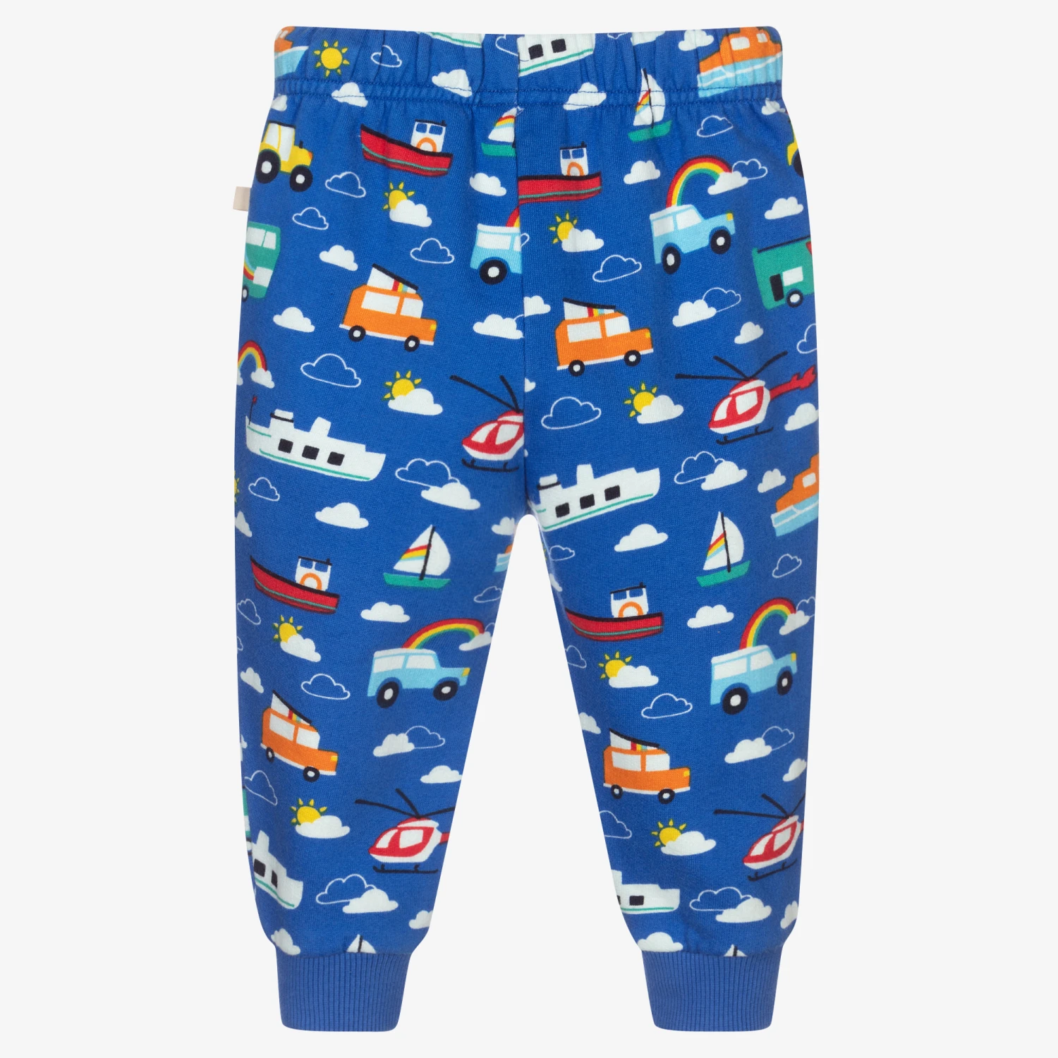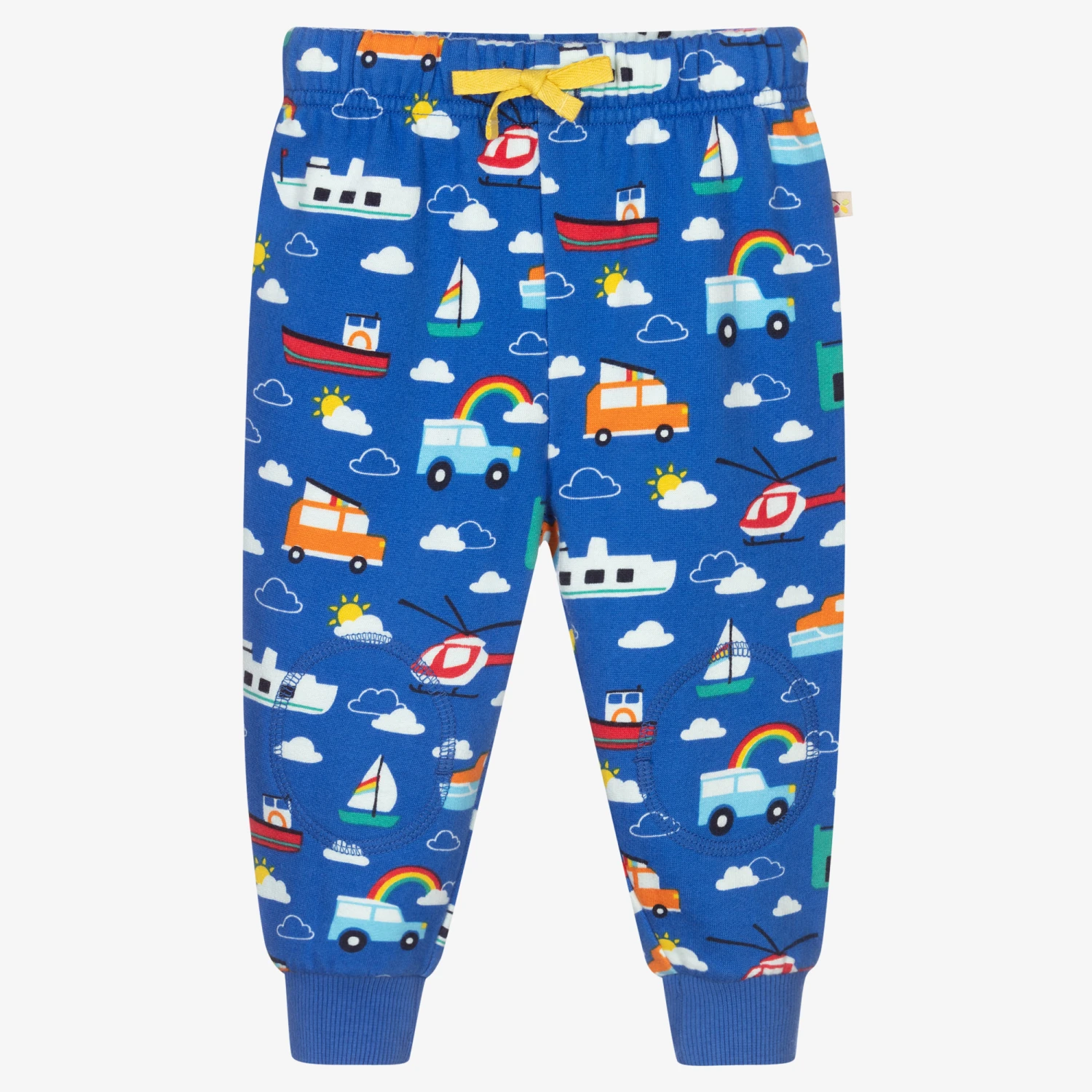 Blue joggers for boys by British brand Frugi, made in soft organic cotton sweatshirt jersey with a fleecy inside. They have an all-over fun, colourful vehicle print, reinforced knees and ribbed leg cuffs. The waistband is elasticated, with a drawstring tie for comfortable wear.