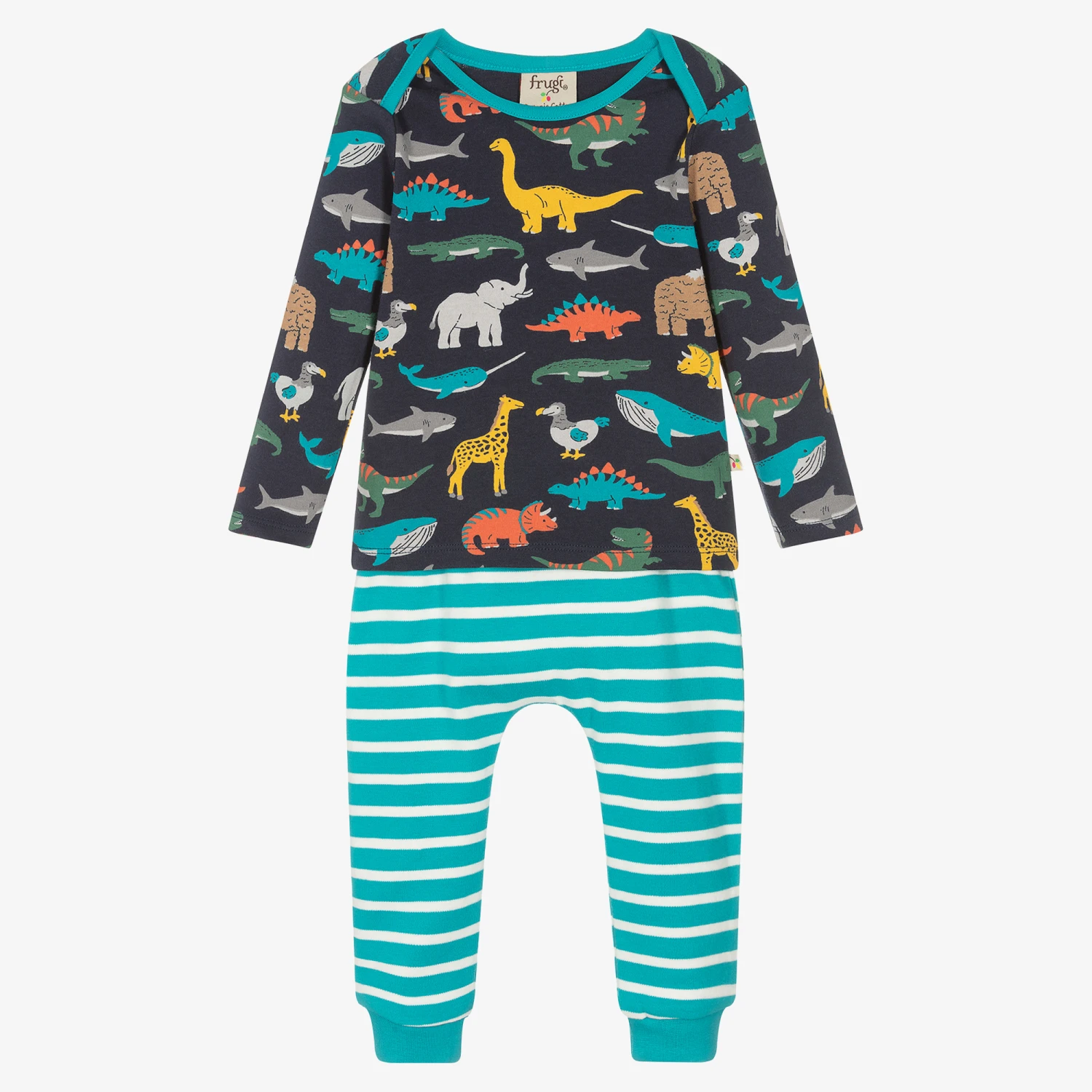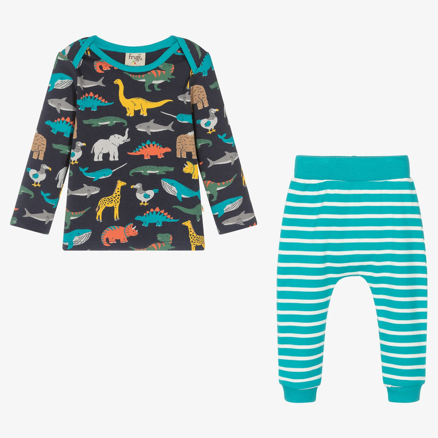 Cute trouser set for little boys and girls by British brand Frugi, made in soft and stretchy organic cotton jersey. The navy blue top is patterned with colourful past and present animals and has a useful envelope neckline for easy dressing. The trousers are turquoise blue with white stripes. They have cosy ribbed trims and a comfortable elasticated waistband.