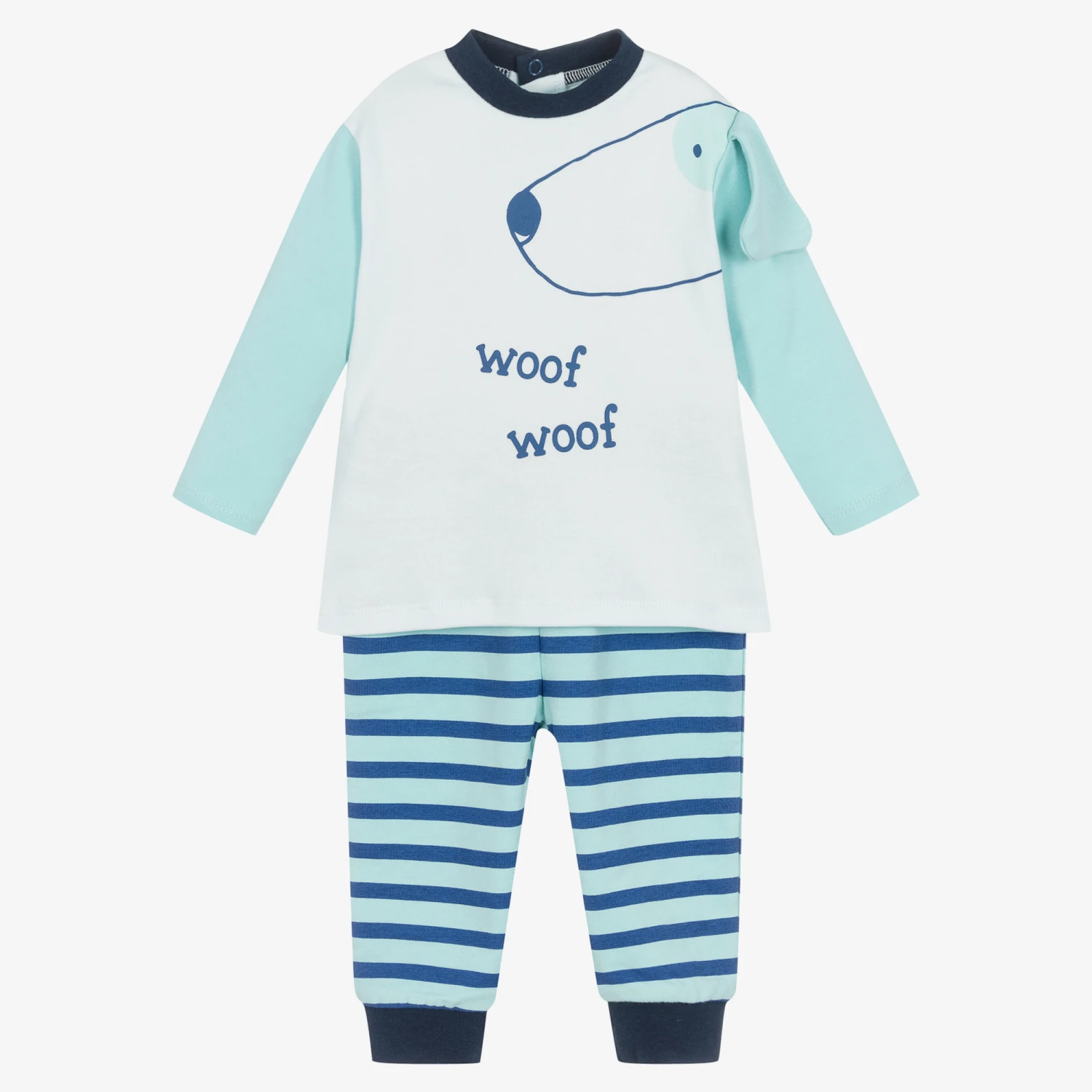 Lovely pastel green and blue trouser set for little boys by FS Baby, made in soft cotton jersey. The top has a fun puppy print on the front, with ‘woof woof’ printed below in blue. It is designed with tonal green sleeves, navy blue trim at the neckline and popper fastenings on the back. The joggers have coordinating blue and green stripes and a fixed drawstring tie on the gently elasticated waistband.