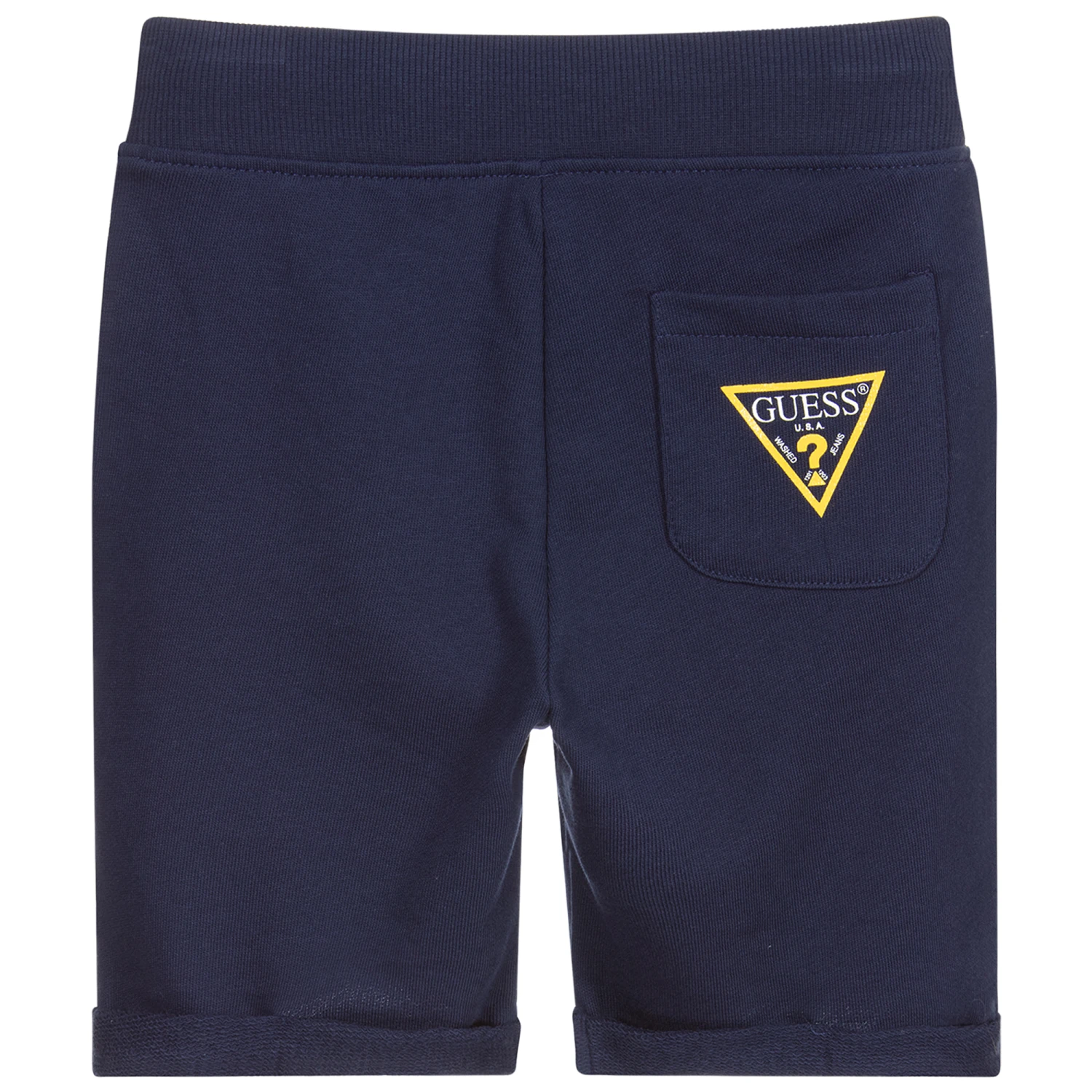 Comfortable navy blue jersey shorts for boys by Guess, made in soft cotton with a drawstring waist. They have pockets on the front and a yellow and white logo print on the back pocket.