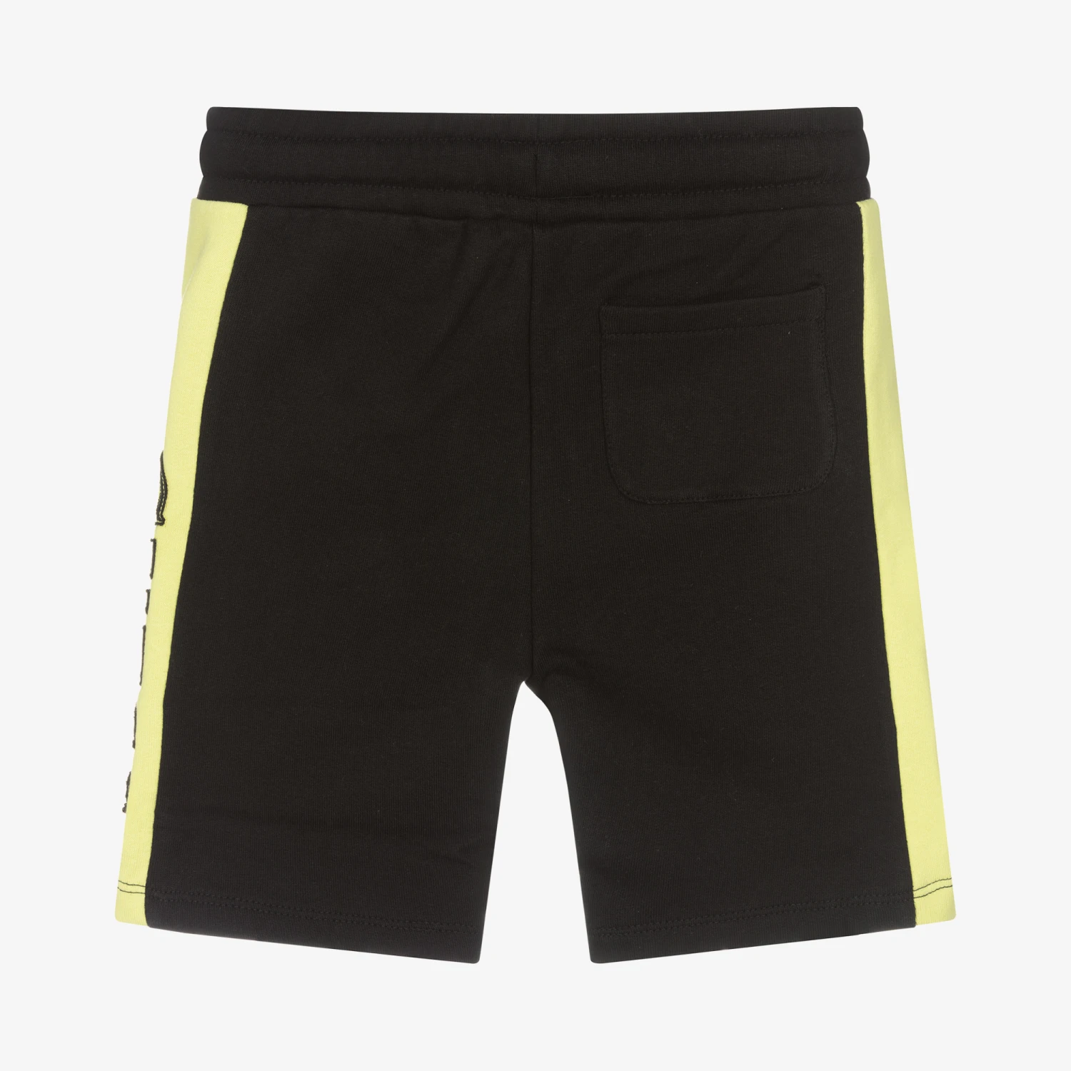 Black Bermuda length shorts for younger boys by American brand Guess, with lime green panels on both sides. There is a black logo appliqué with raw edges on one leg for a casual vibe, two pockets on the front and one on the back. Easy to wear with an adjustable drawstring on the elasticated waist, they are made in comfortable cotton sweatshirt jersey.