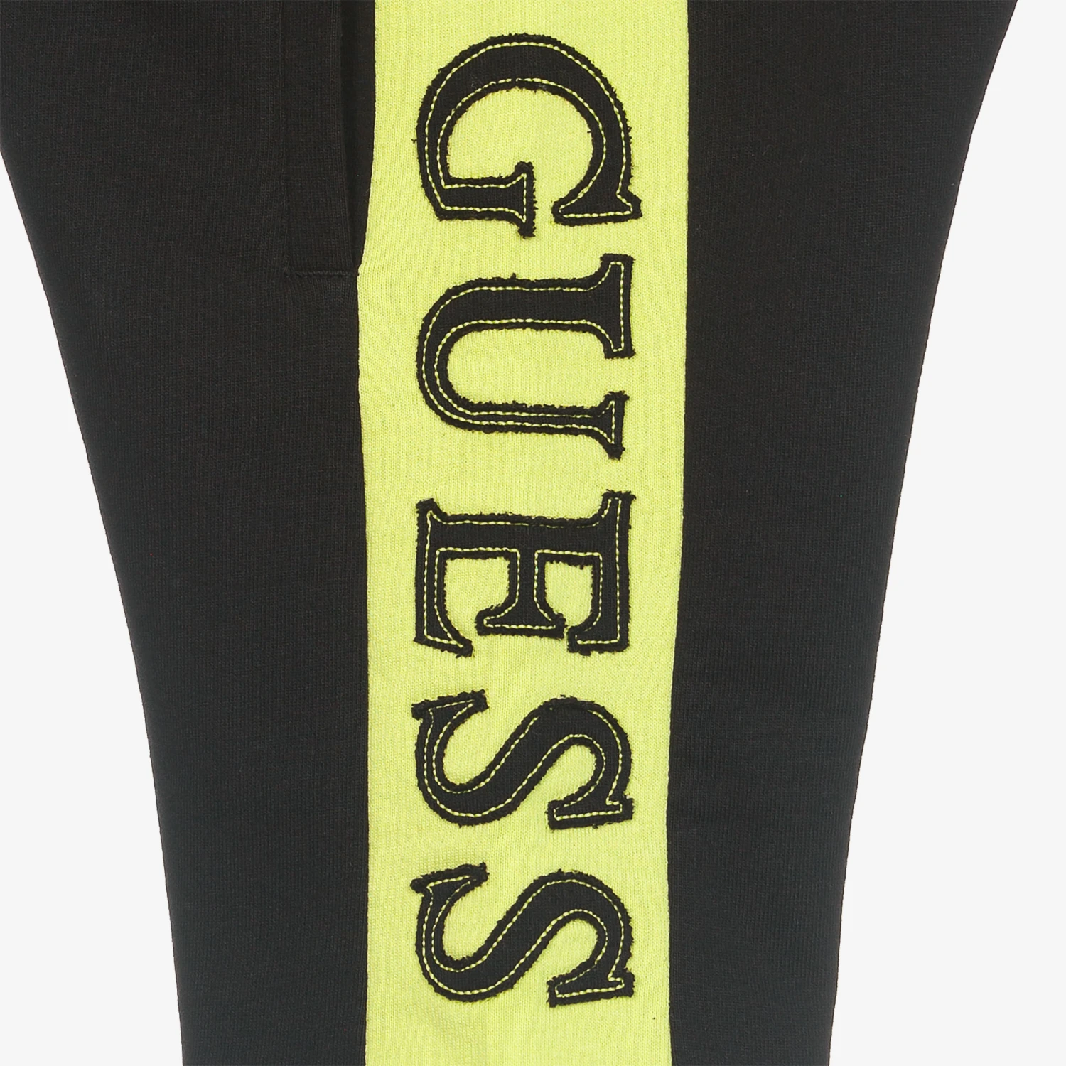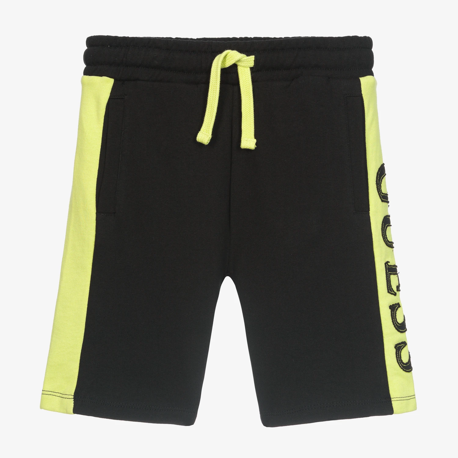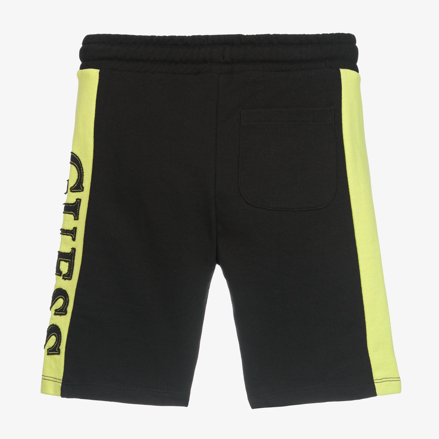 Black Bermuda length shorts for boys by American brand Guess, with lime green panels on both sides. There is a black logo appliqué with raw edges on one leg for a casual vibe, two pockets on the front and one on the back. Easy to wear with an adjustable drawstring on the elasticated waist, they are made in comfortable cotton sweatshirt jersey.