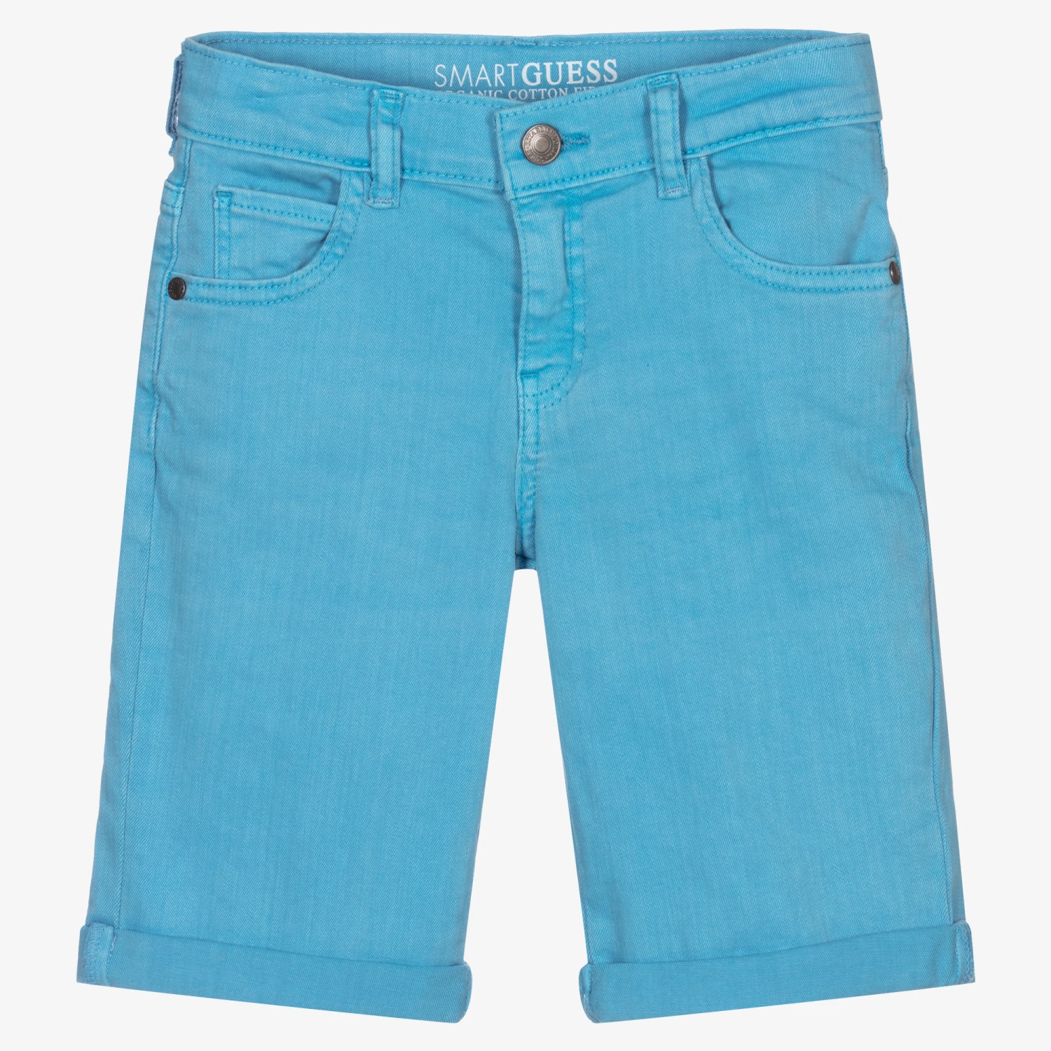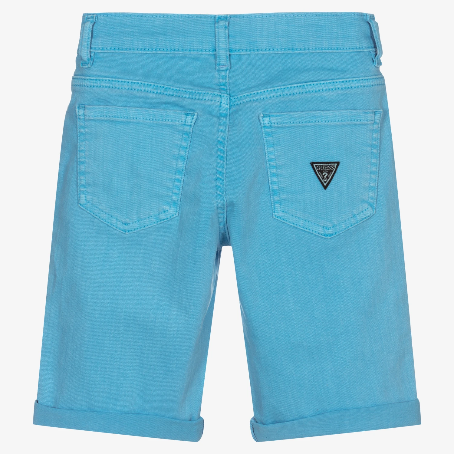 Boys blue regular-fit denim shorts from Guess, made in stretch organic cotton denim. In a classic five-pocket style, they have rolled-up cuffs and a Triangle logo badge on the back. They fasten with a button and zip on the front and have an adjustable waistband.