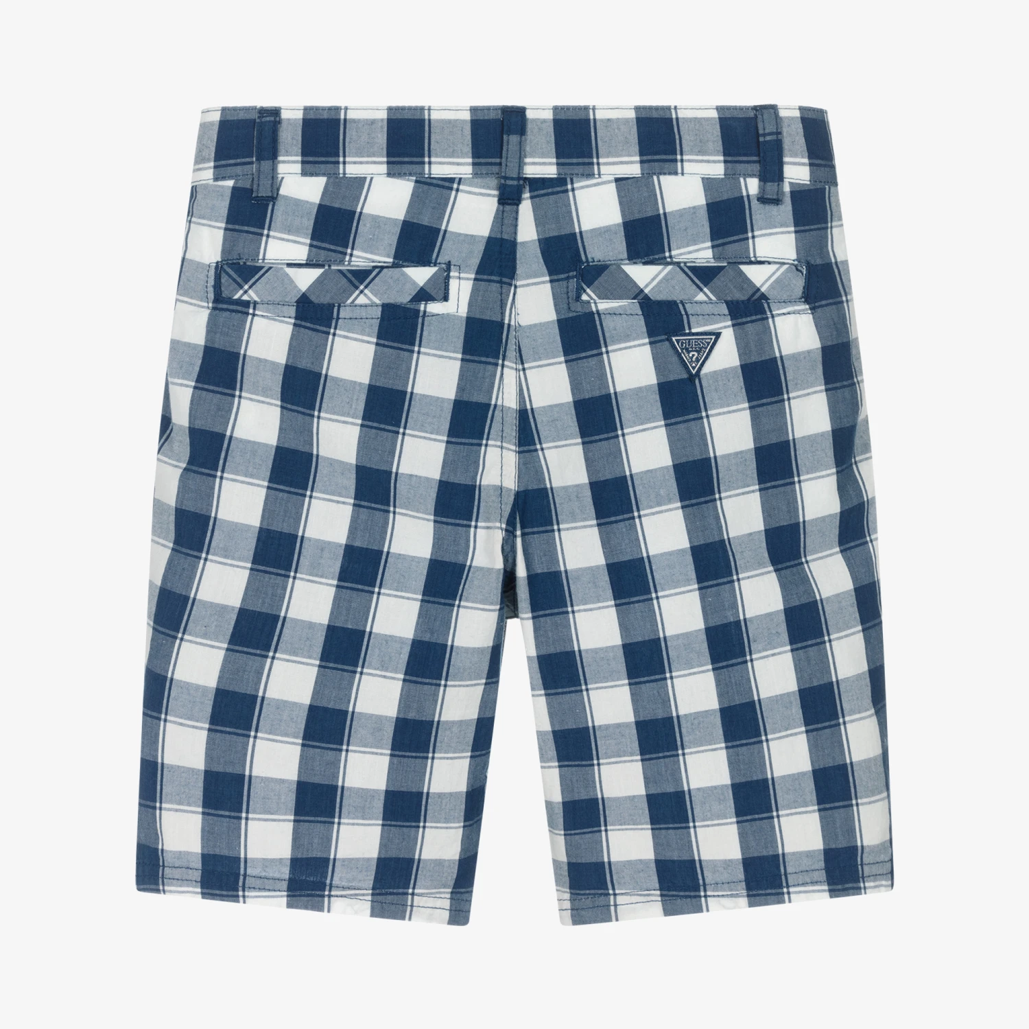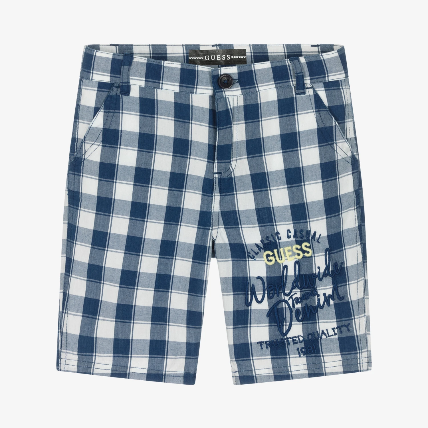 Boys blue and white check shorts by Guess. Made in soft and lightweight cotton, these Bermuda-length shorts have a button and zip fastening, with side pockets and logo embroidery on one leg. There are two pockets on the back and belt loops, plus an adjustable waistband.