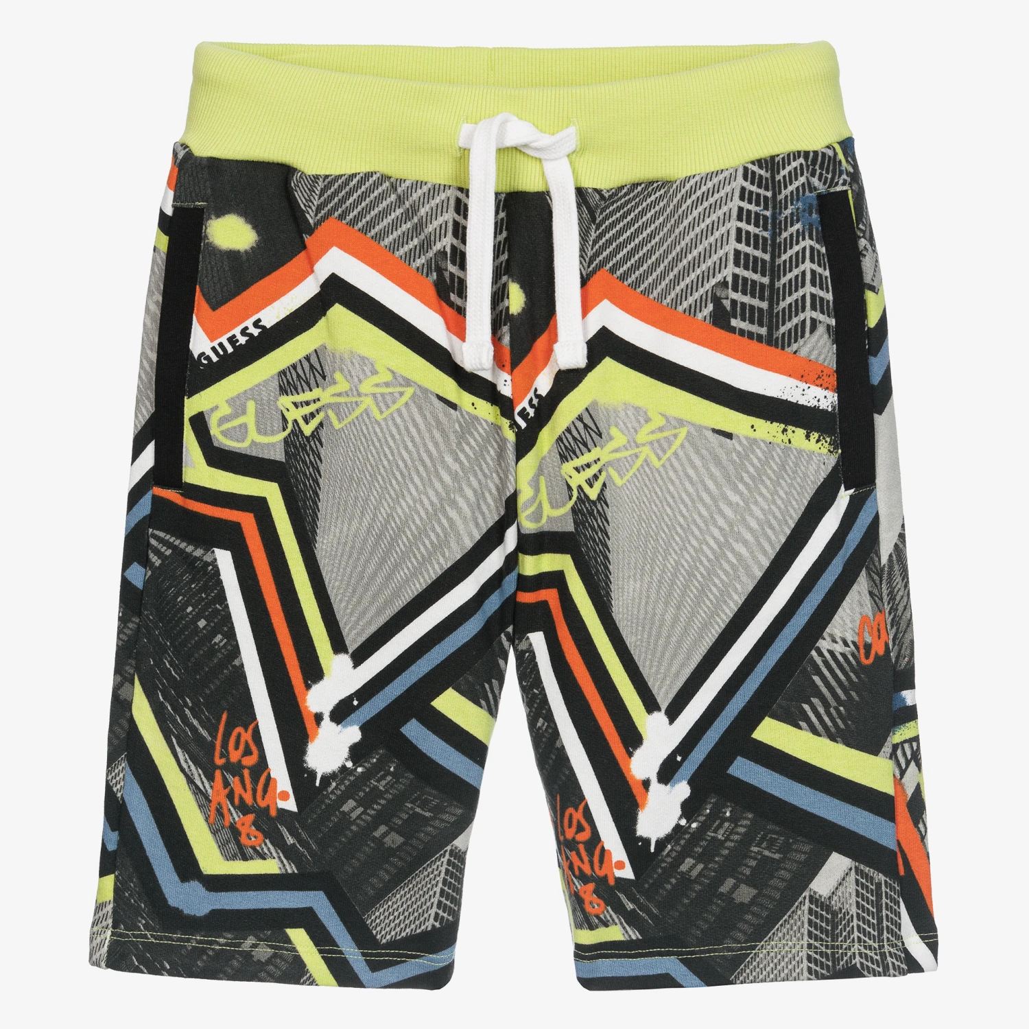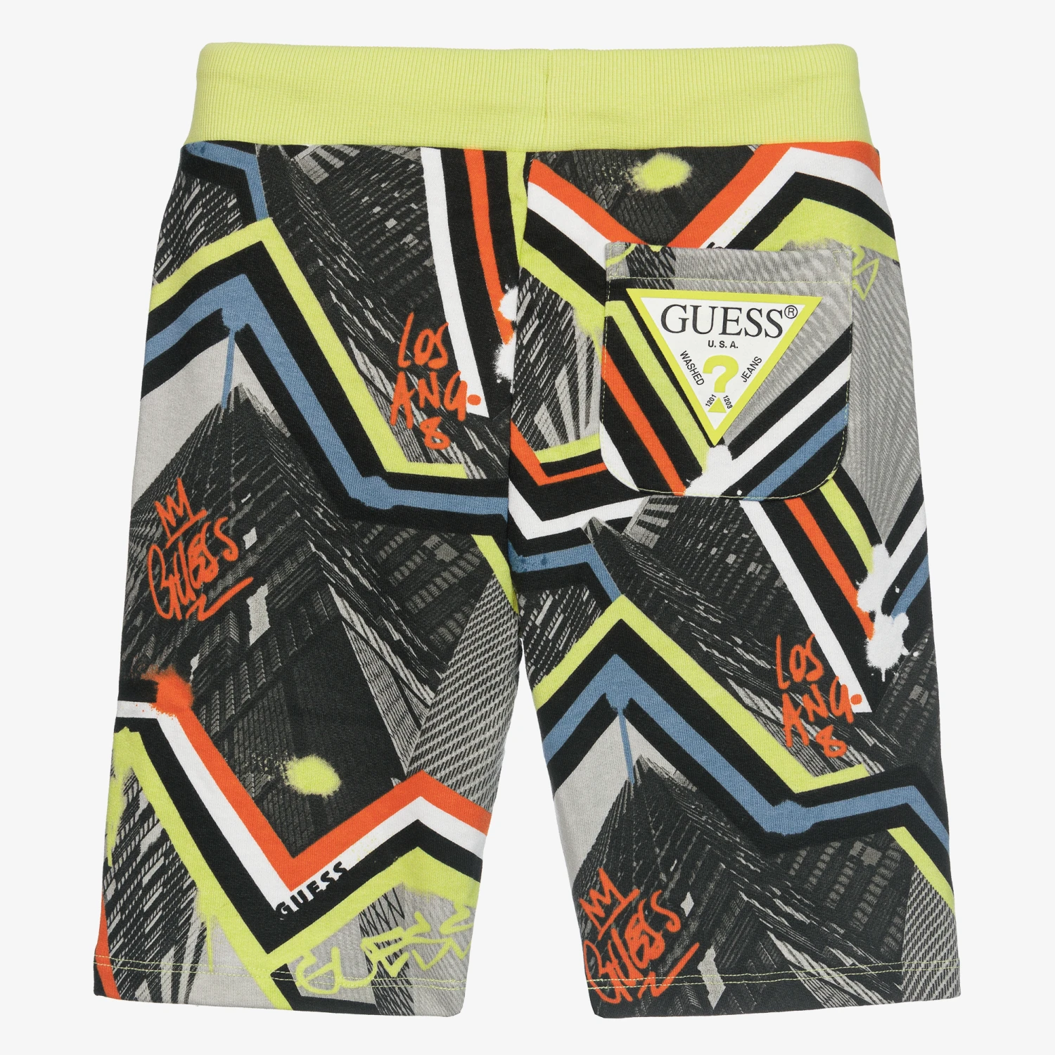 Cool grey and black shorts for boys by Guess, printed with skyscrapers and vibrant geometric stripes for a streetwear vibe. There are two pockets on the front and one on the back with the iconic triangle logo printed in green and white. Adjustable with a white drawstring for a good fit, the ribbed waistband is in a contrasting pale green. These comfortable Bermuda length shorts are made in soft cotton sweatshirt jersey.