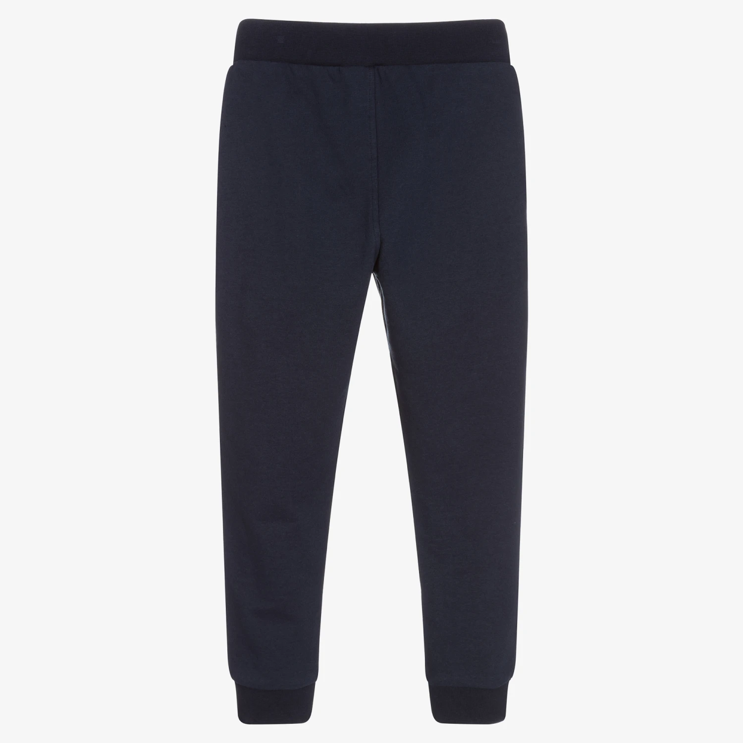 Navy blue joggers for boys by Hackett London, made in soft mid-weight cotton jersey. They have a blue and white logo print on one leg and useful side seam pockets. The waistband is elasticated with a faux drawstring detail.