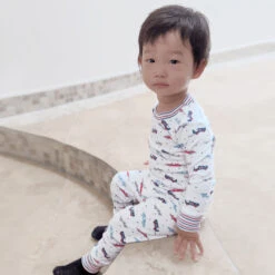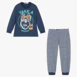 Fun blue pyjamas for boys by Hatley, patterned with blue, green and yellow monsters. Made in soft organic cotton jersey, they have navy blue raglan sleeves.