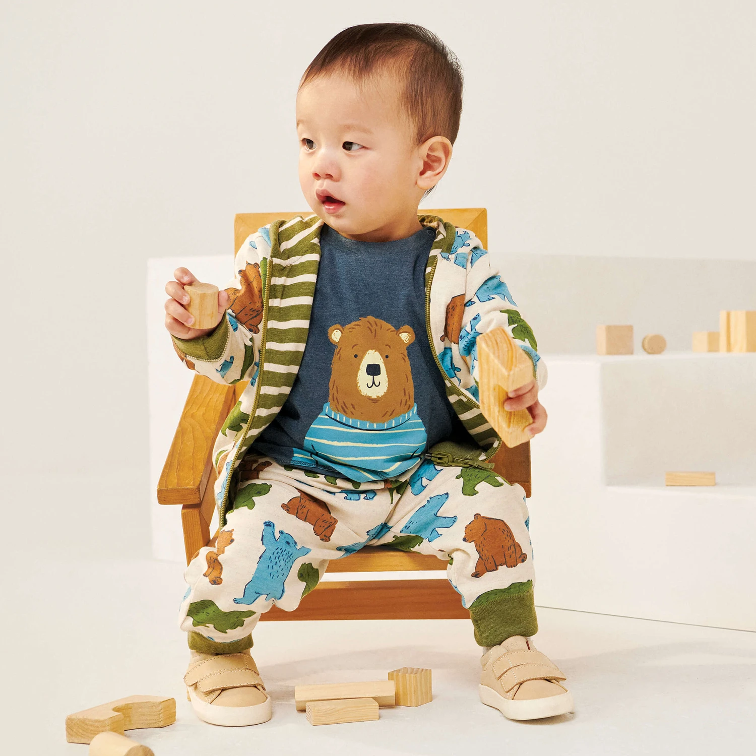 Reversible joggers for little boys by Hatley, made in comfortable cotton jersey with green ribbed trims. One side has ivory and green stripes, whilst the other is patterned with green, blue and brown bear cubs.