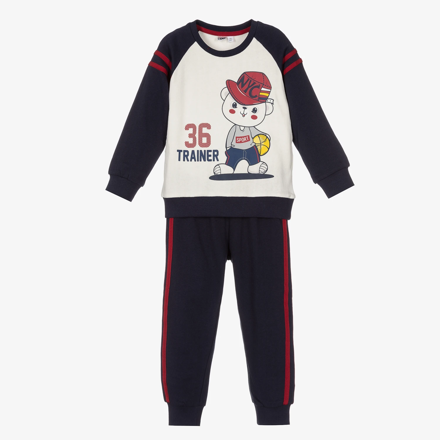 Navy blue and ivory tracksuit for boys by iDO Baby, made in soft cotton jersey. The sweatshirt has an ivory body and navy blue raglan sleeves, with red herringbone stripes and a cute sporty bear print on the front. The navy blue bottoms have an elasticated waist and matching red stripes on the side of the legs.