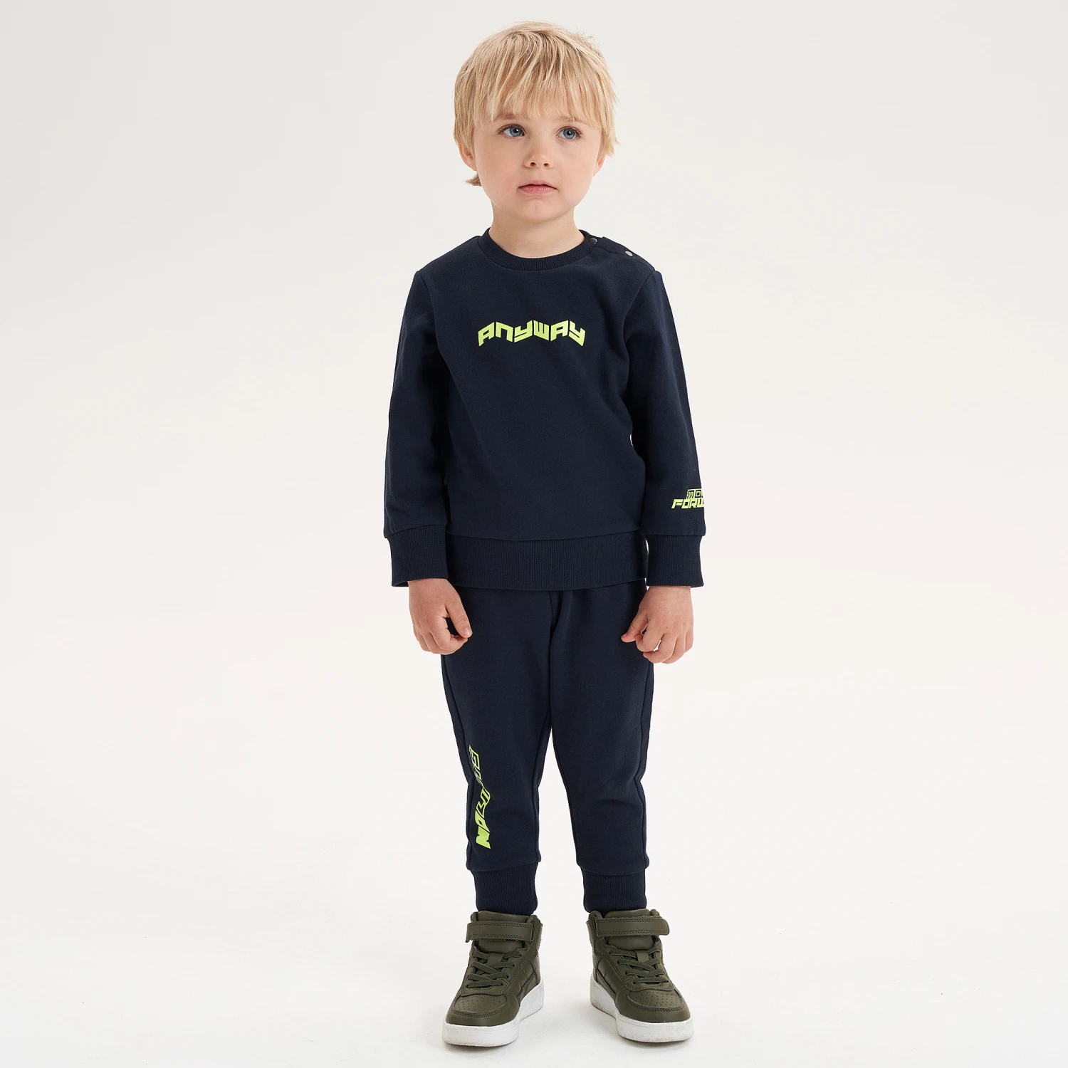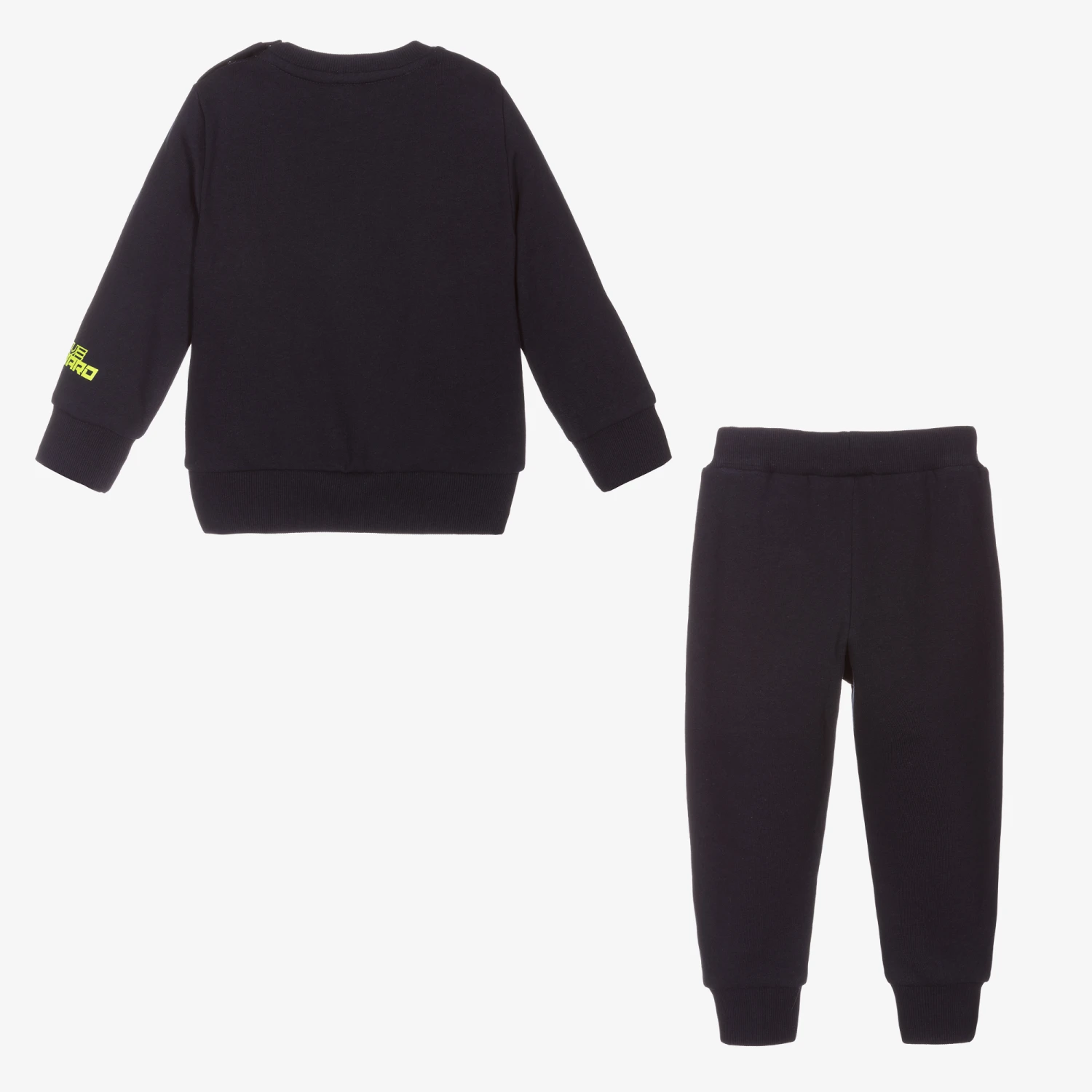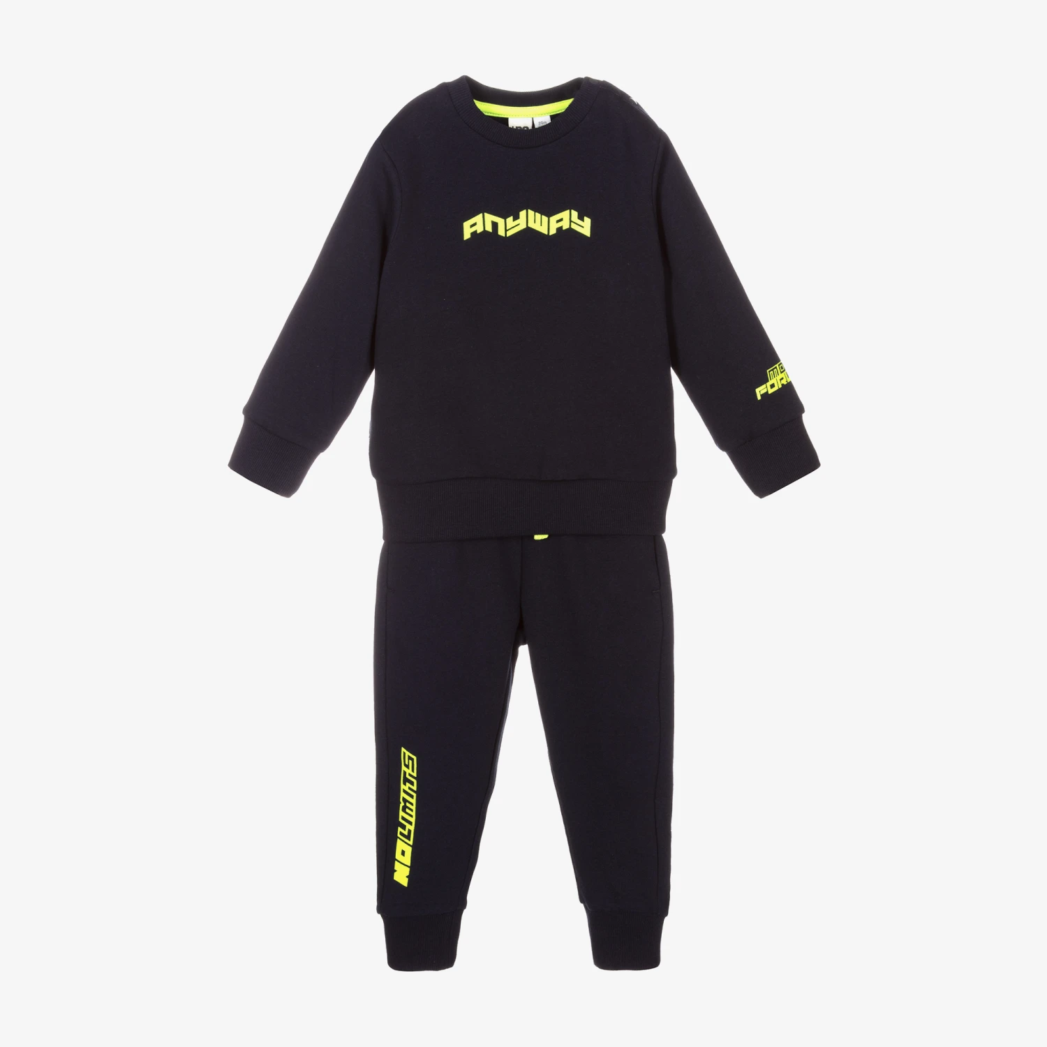 Boys navy blue tracksuit by iDO Baby, made in mid-weight cotton jersey. The sweatshirt top has a neon green slogan print on the front and arm. Smaller sizes fasten with easy shoulder poppers. The bottoms have a neon green print on one leg and matching drawstring cords.