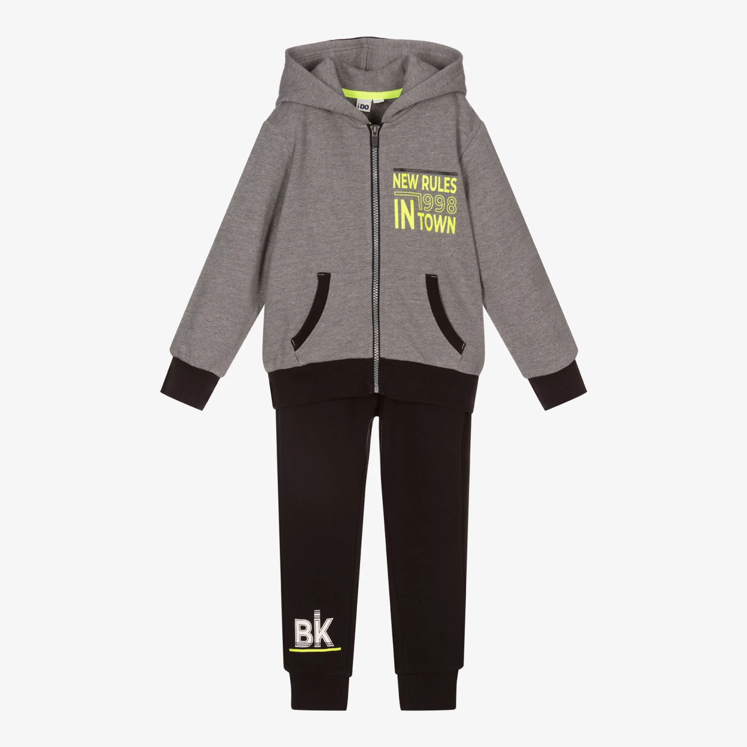 Boys grey and black tracksuit from iDO Baby, with neon green prints. Made in soft cotton jersey with a fleecy feel inside, the hooded zip-up top has black ribbed trim and a pouch pocket on the front. The comfortable joggers have front pockets and a drawstring waist.