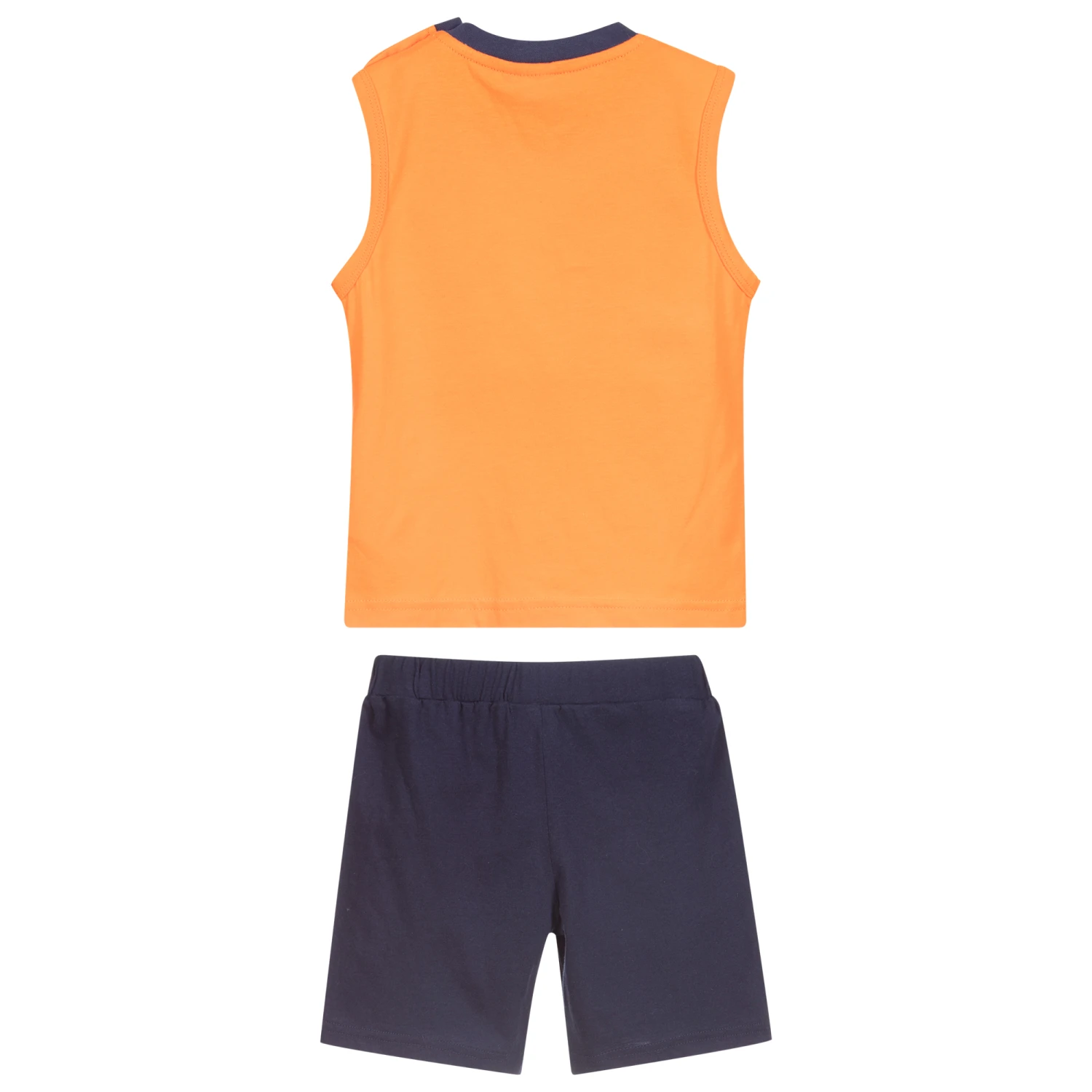 An orange and navy blue sleeveless T-shirt and shorts set for boys by iDO Baby. Made in soft stretchy cotton jersey, the T-shirt has button fastenings on one shoulder and a cute Bing Bunny cartoon character and friends print. The navy blue jersey shorts have a comfortable elasticated waistband.