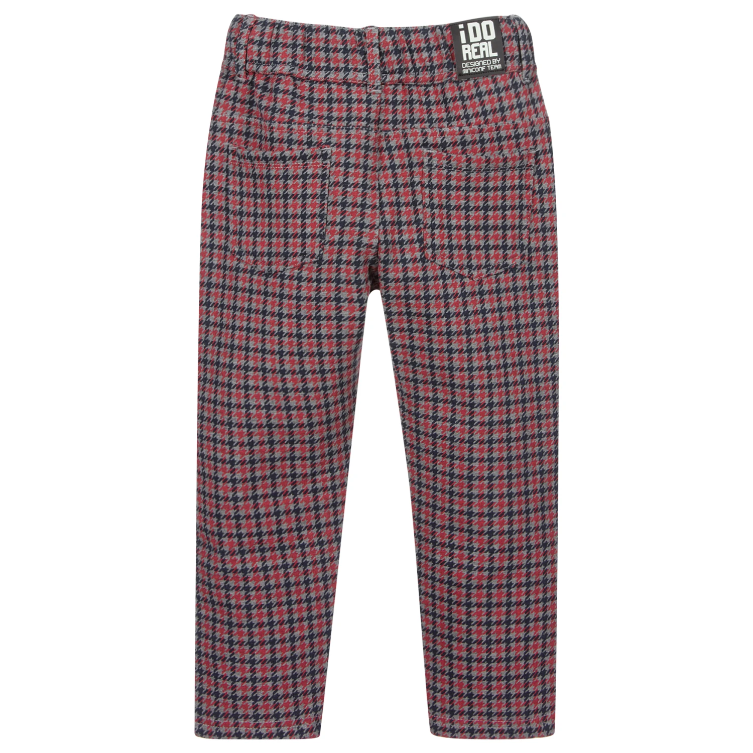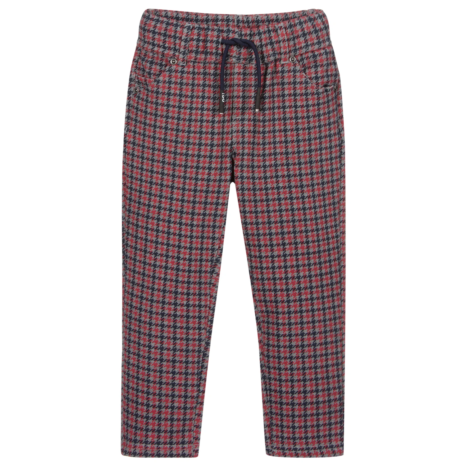 Grey trousers for boys by iDO Baby, made in soft cotton jersey with a fleecy inside. They have a navy blue and red houndstooth check, four pockets and an elasticated drawstring waist.