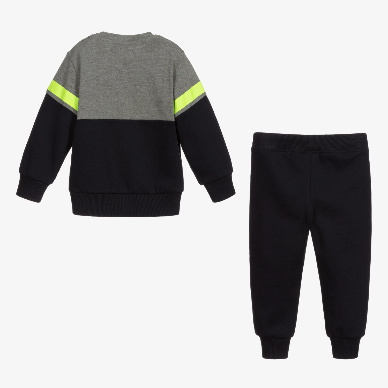 Navy blue tracksuit for boys by iDO Baby, made in soft jersey, with a fleecy inside. The top has grey and neon green trims, with a ‘Free Spirit’ motif on the front and poppers on one shoulder. The joggers have a neon green and navy blue ‘Make it Possible’ slogan on one leg, front pockets and a drawstring waist.