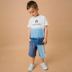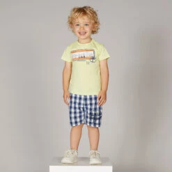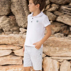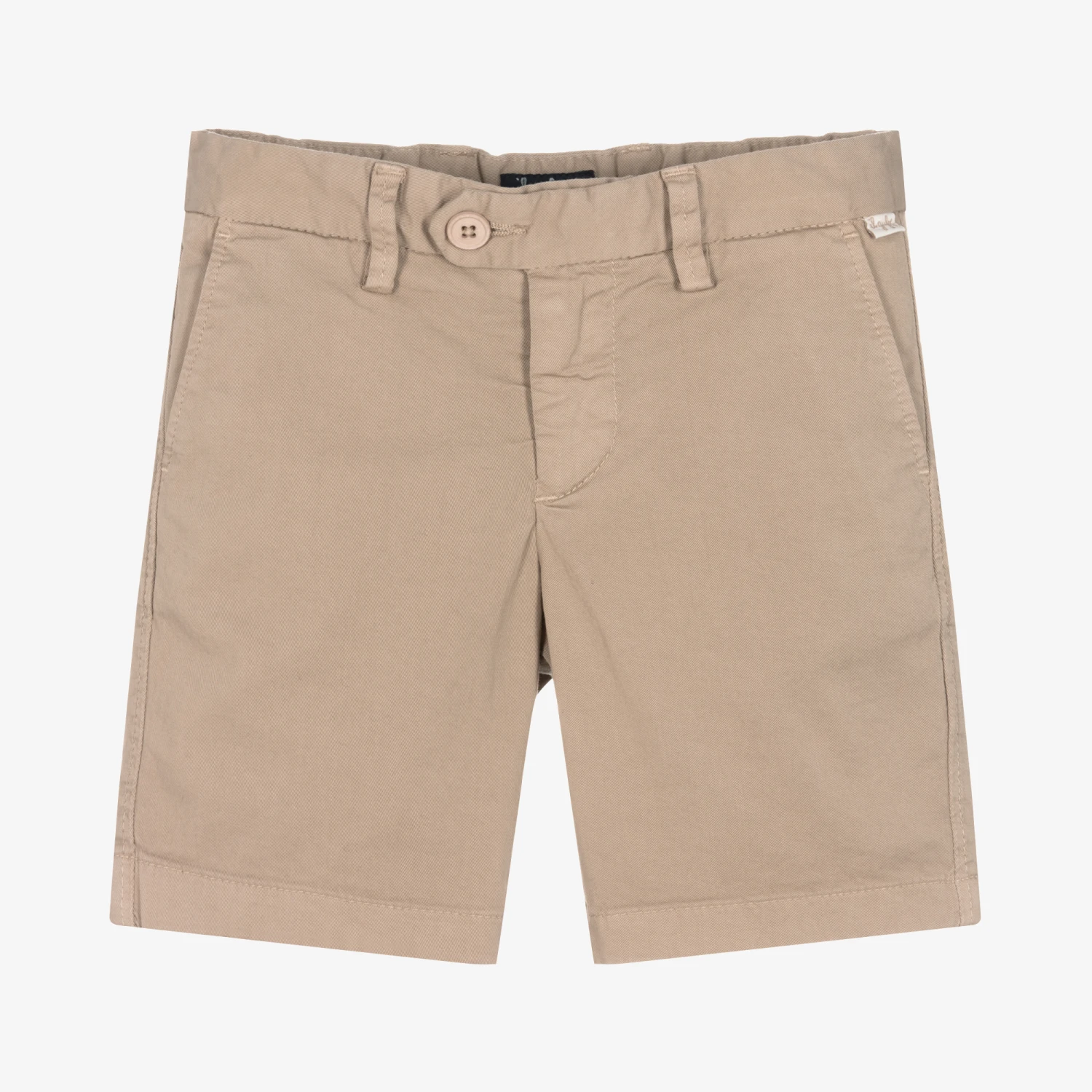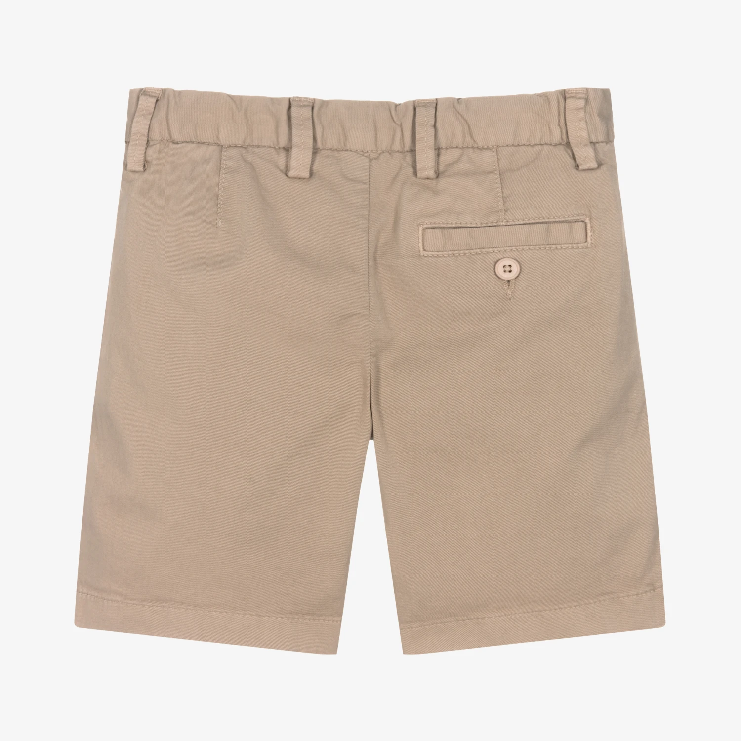 Beige Bermuda shorts for boys from luxury Italian brand Il Gufo. Made in lightweight cotton twill with a light stretch, they are cool and comfortable to wear. They fasten with a zip and two buttons for a secure fit, whilst an internal adjustable waist allows for a little growth. A small logo tab is stitched to the hem above one of the front pockets for a subtle designer touch.