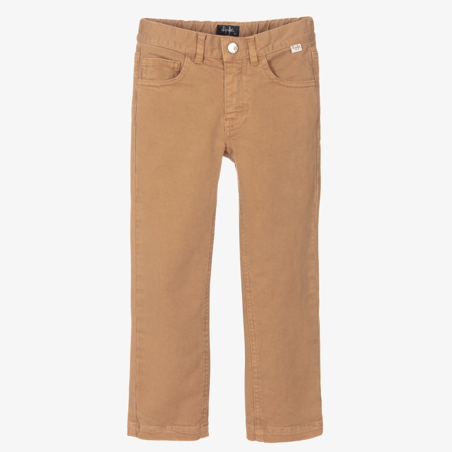 Dark beige trousers for boys by luxury Italian brand Il Gufo, made in soft cotton twill. In a classic five-pocket style, they have a popper and zip fastening, with an adjustable waistband for a comfortable fit.