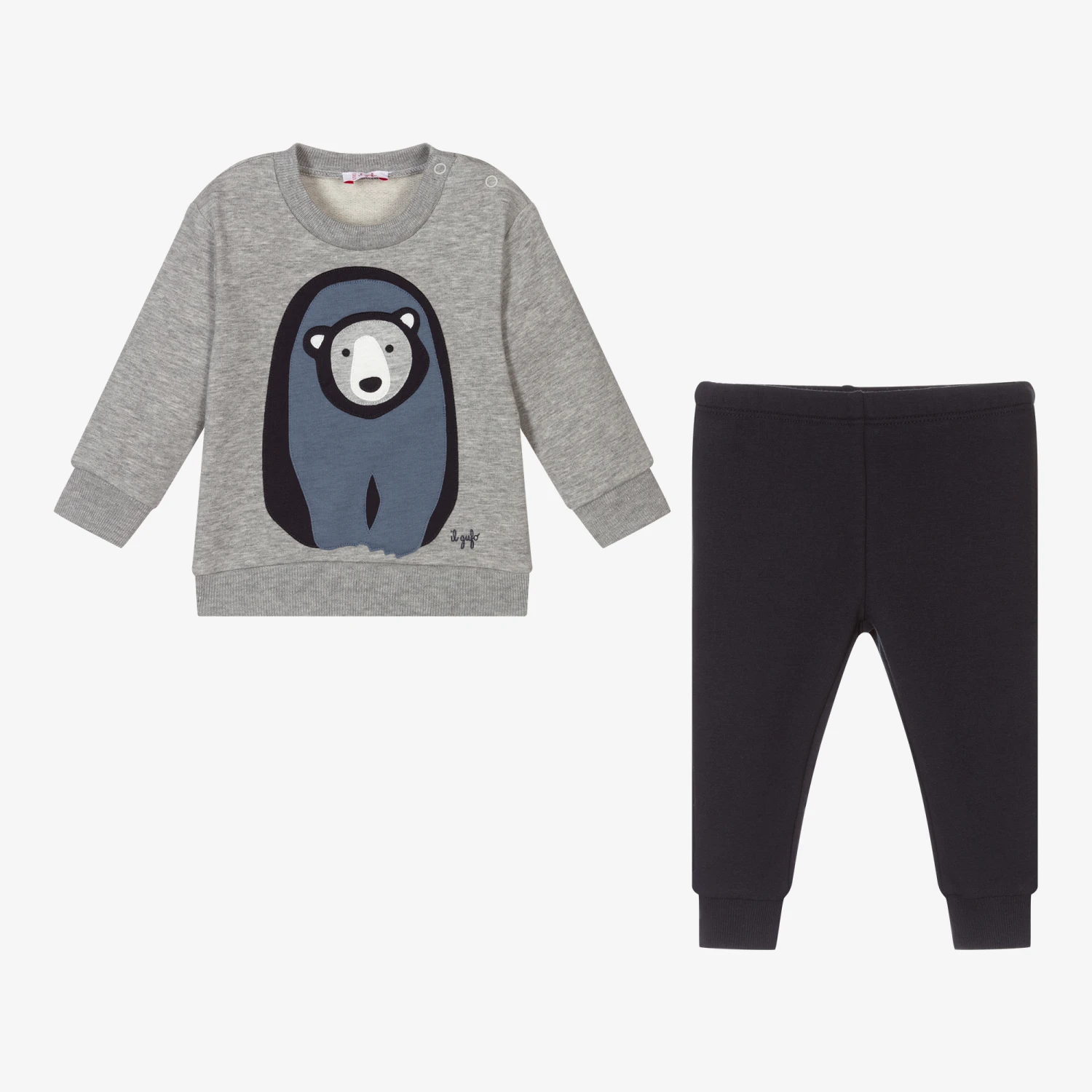 Made in soft cotton jersey, this cute tracksuit for little boys is by luxury Italian brand Il Gufo. The grey top has a blue and grey polar bear motif on the front, with popper fastenings on one shoulder. The navy blue joggers have an elasticated waistband and ribbed ankle cuffs.