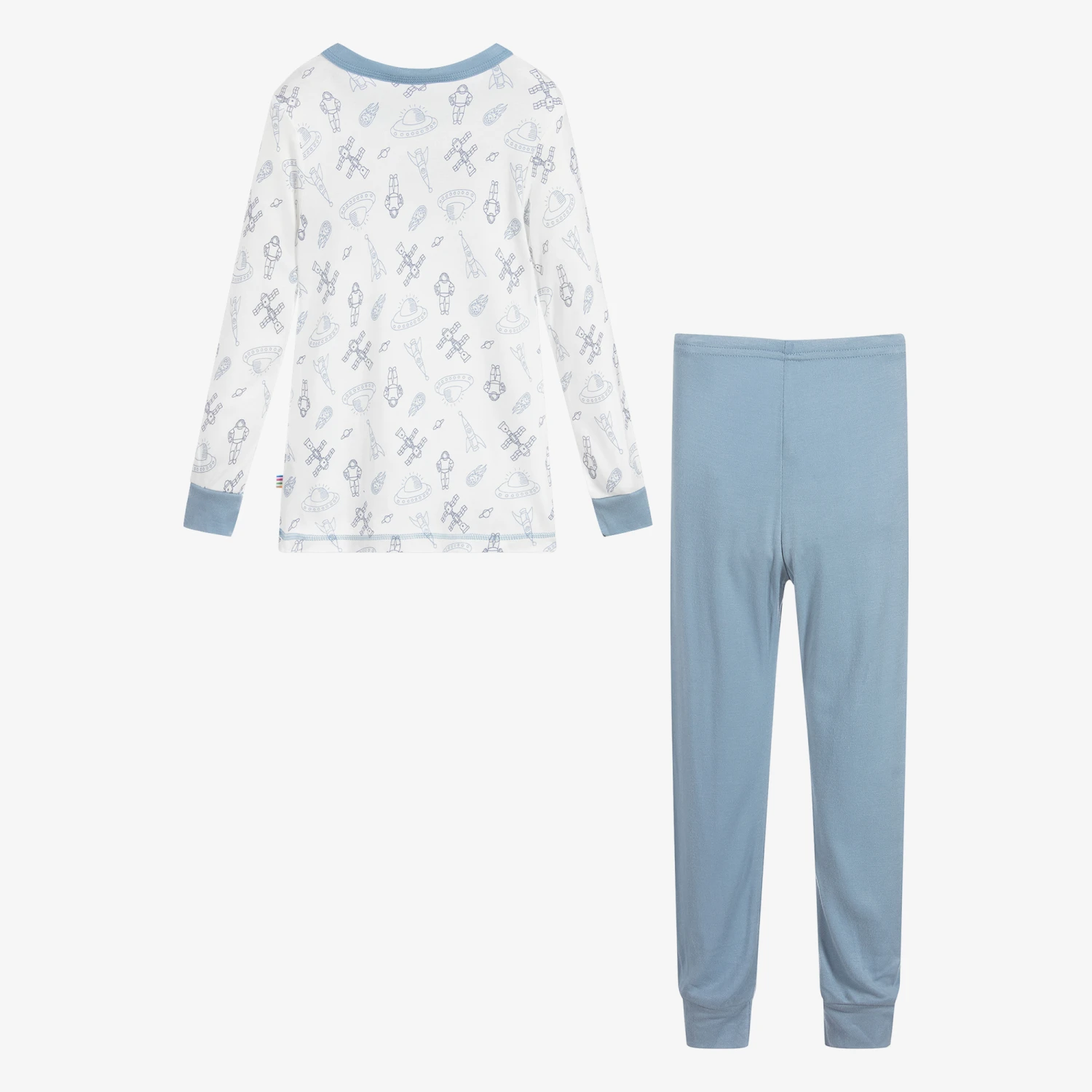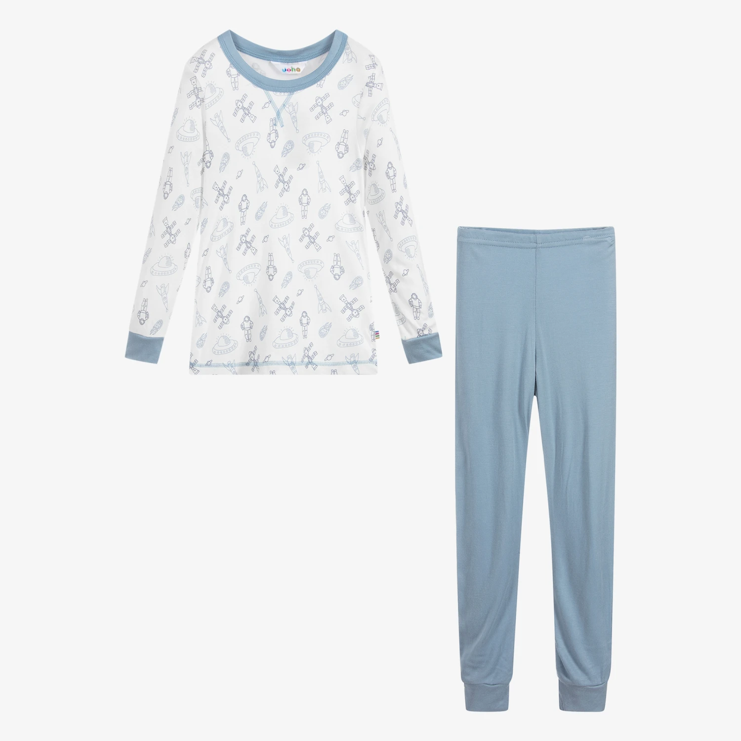 Boys blue and white thermal pyjamas, with a fun space themed pattern by Joha. Made in soft, organic, bamboo, viscose jersey, with gently ribbed blue trims.