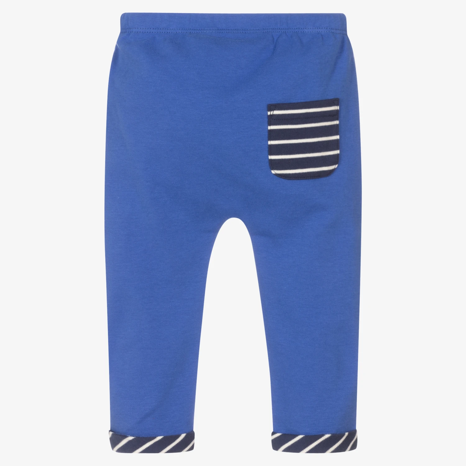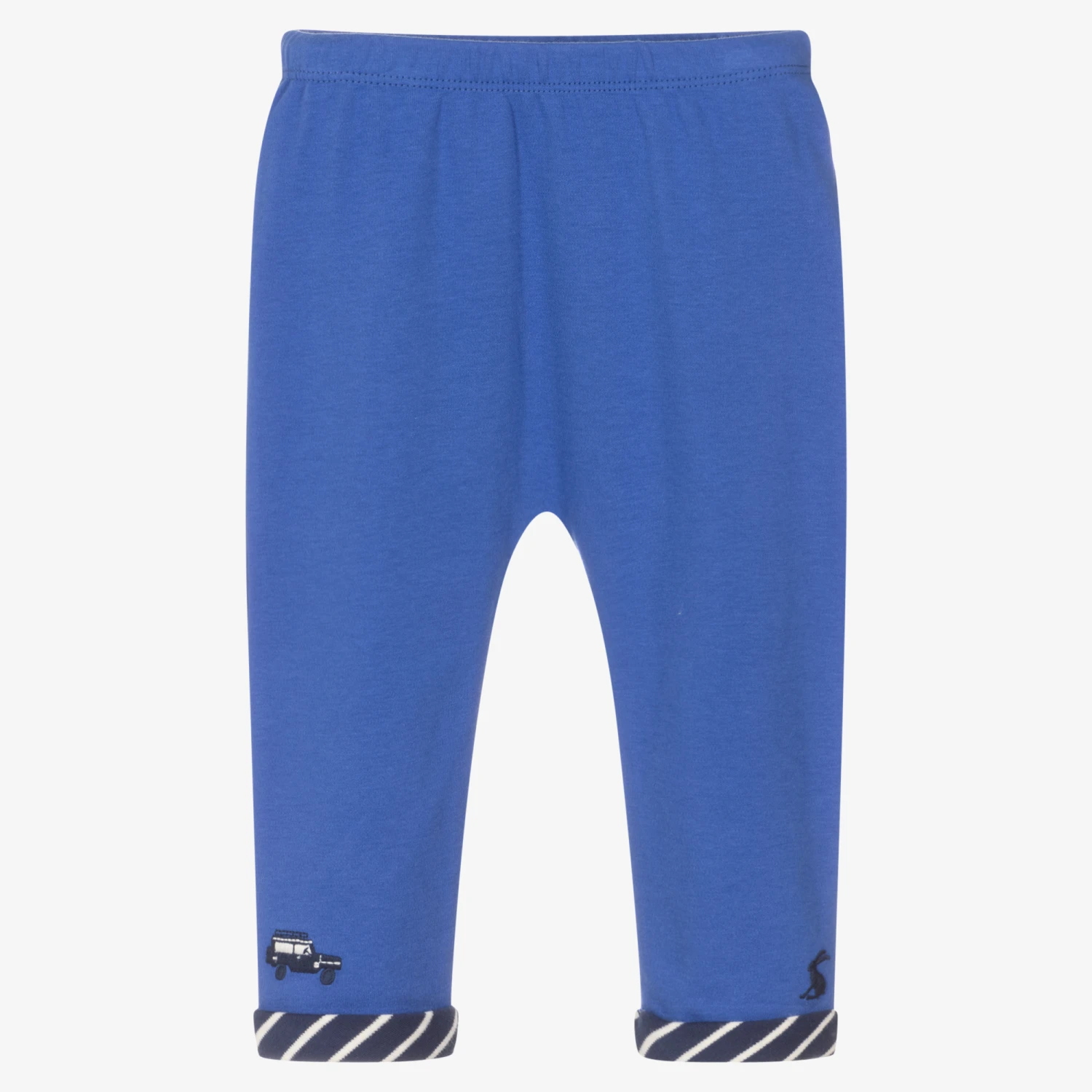 Comfortable for baby boys, bright blue casual trousers are from British label, Joules. They are made in soft cotton jersey with a cool truck embroidered on one ankle. These full-length bottoms have cute navy blue and white fixed turn-ups, a matching back pocket and a gently elasticated waistband, gentle on little tummies.