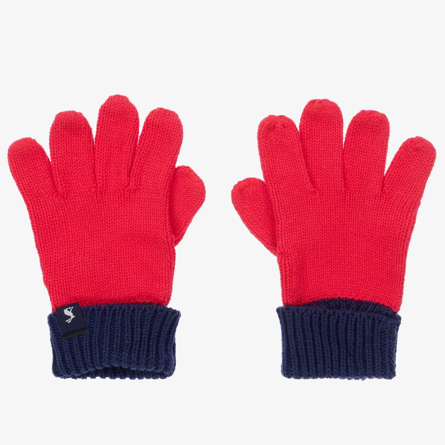 Cute bright red cotton knit gloves for boys by Joules. Great for keeping little hands warm, they have navy blue turn-up trims and hare logo tabs.
