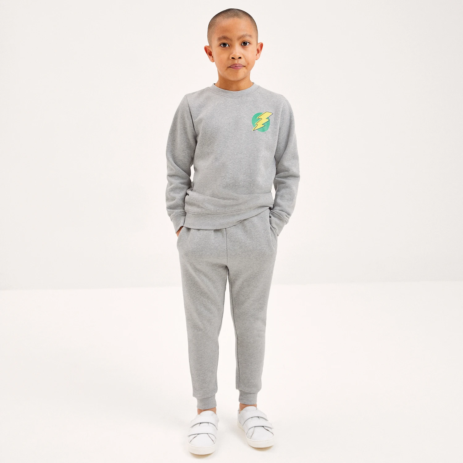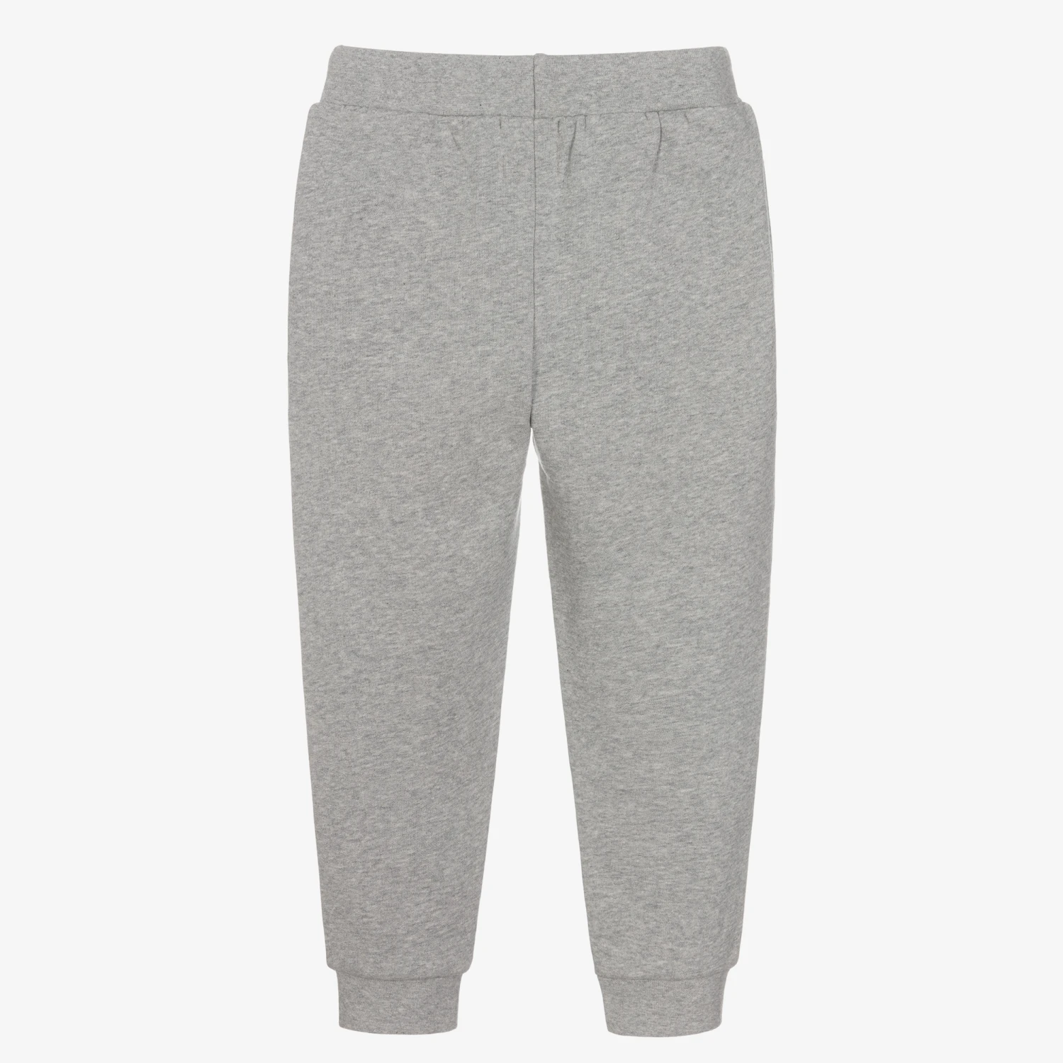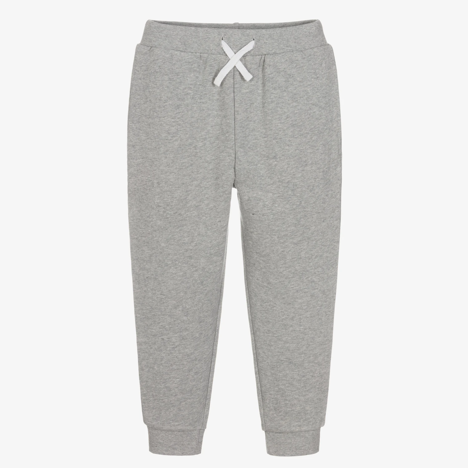 Exclusive to Childrensalon, a pair of grey marl joggers for boys and girls by Joyday. Ideal for laid-back lounging, they are made in comfortable cotton jersey with a warm, fleecy inside. They have a useful drawstring waistband for a good fit and neat, concealed pockets on the side seams.