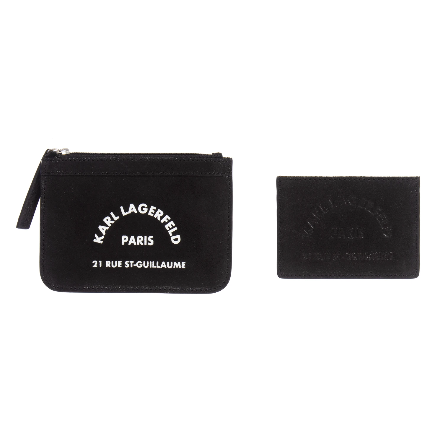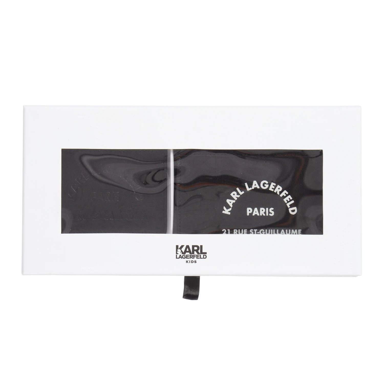 Black purse and card colder for boys and girls by KARL LAGERFELD KIDS. This stylish gift set is made in soft leather and has the brand’s Rue St Guillaume logo name. The logo is printed in white on the purse and embossed on the card holder.