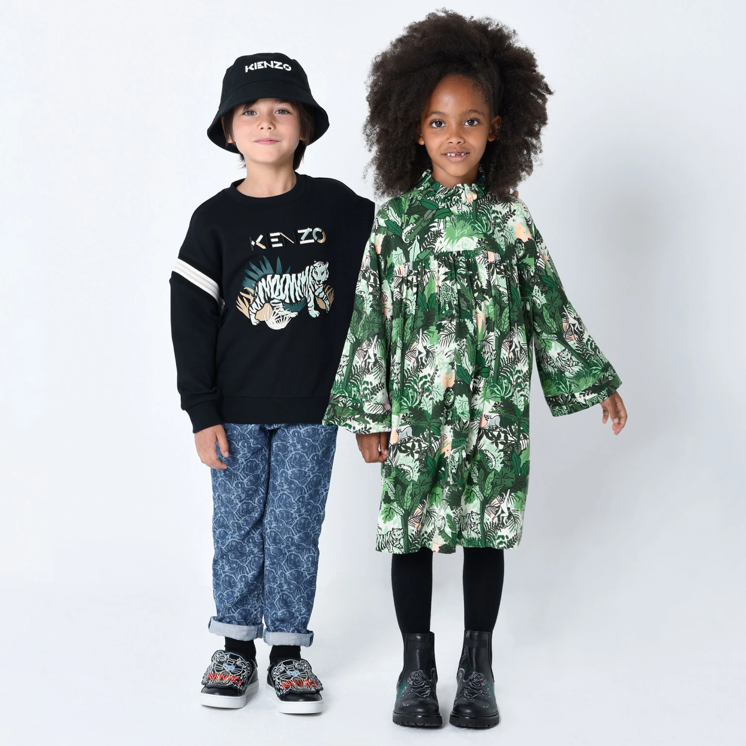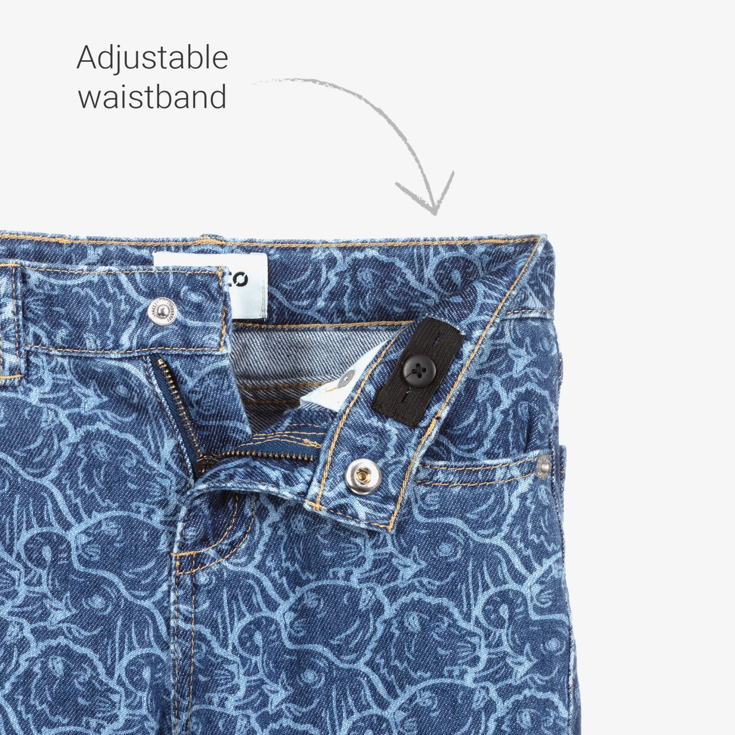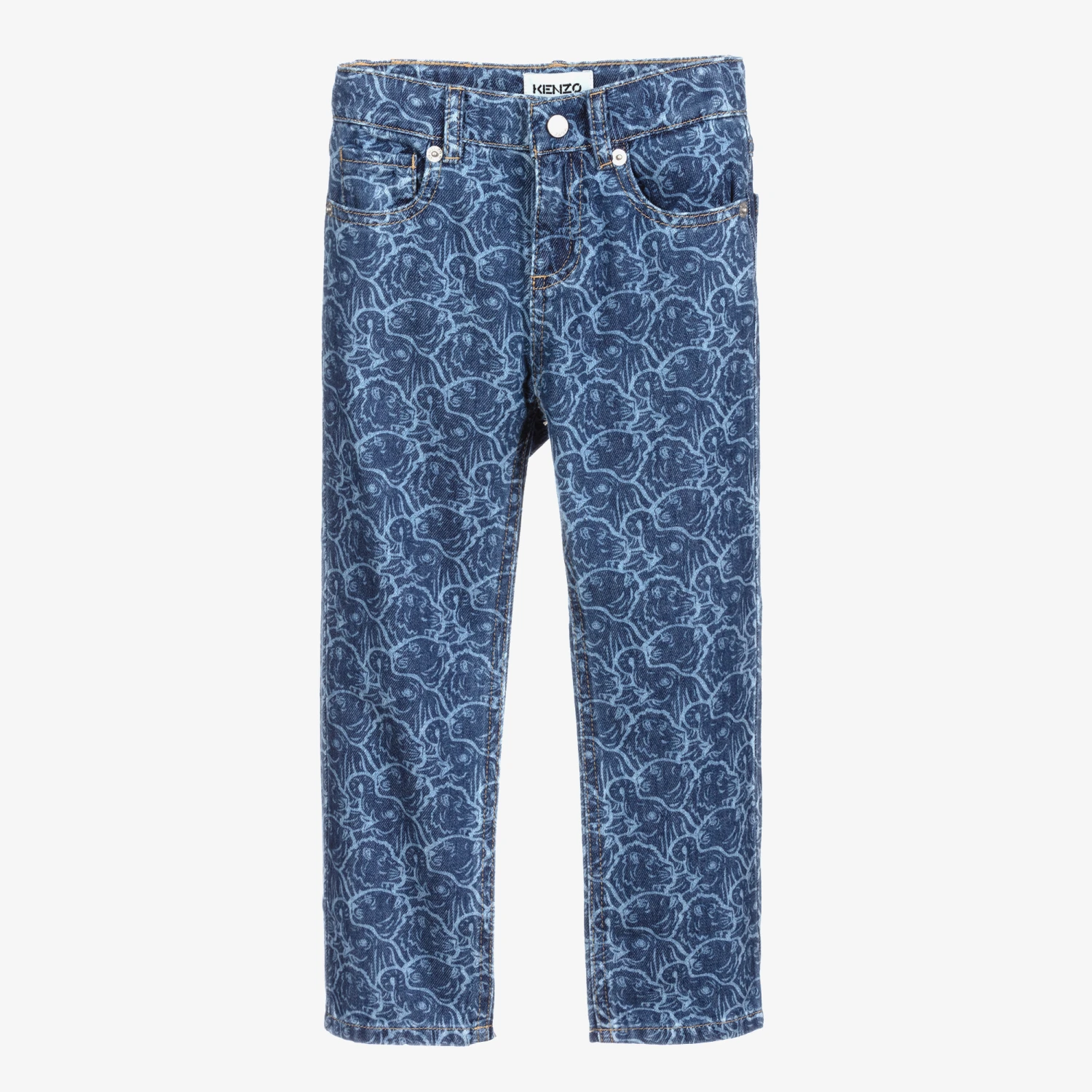 Boy mid-blue slim fit jeans by KENZO KIDS, made in soft, lightweight denim. They are patterned with a wildlife-inspired camo design that features the brand’s Tiger & Friends logo. In a classic five pocket design, they have an adjustable waistband, with a zip and popper fastening.