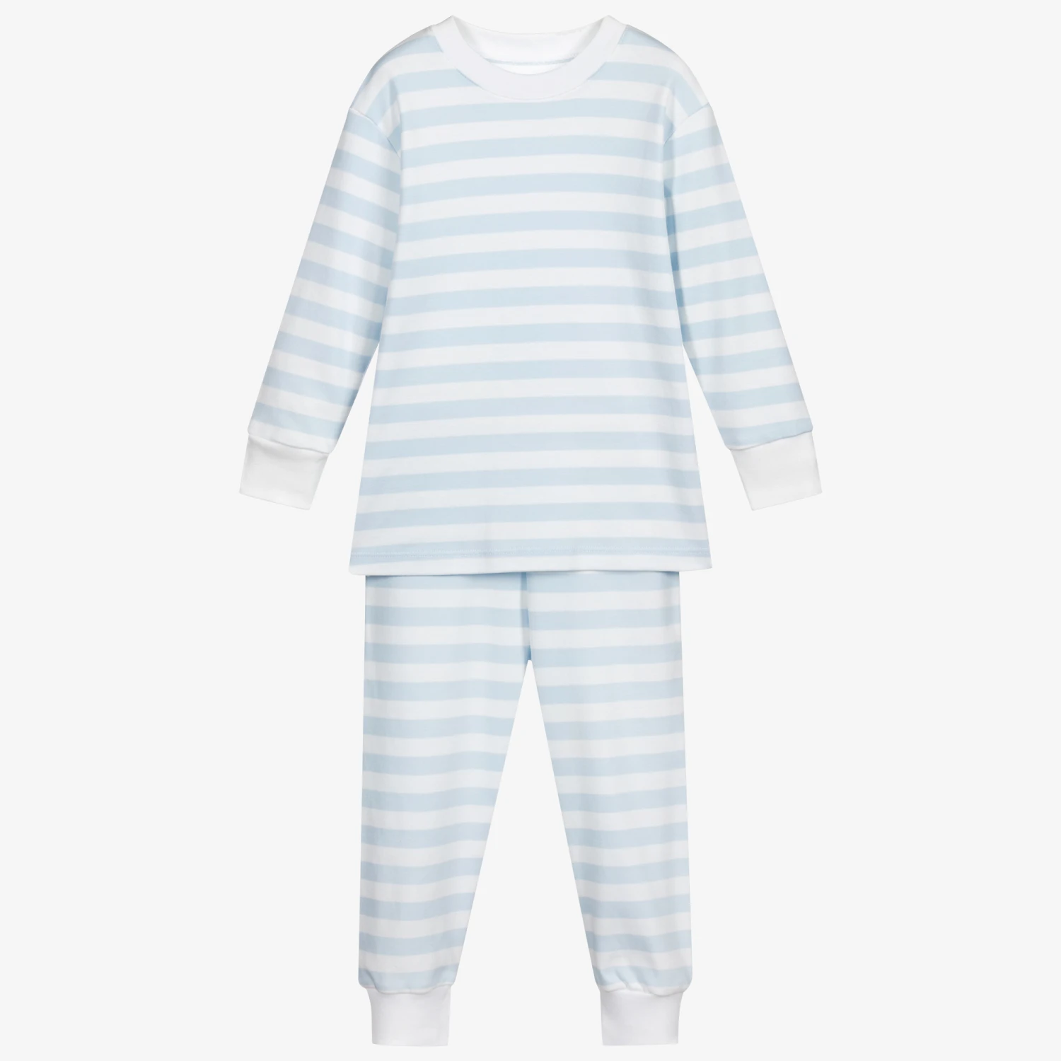 White Pima cotton pyjamas for boys and girls by Kissy Kissy, patterned with pale blue stripes throughout. They have white trims and the bottoms have an elasticated waist.