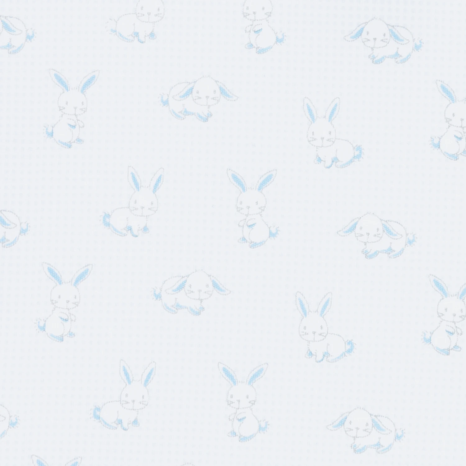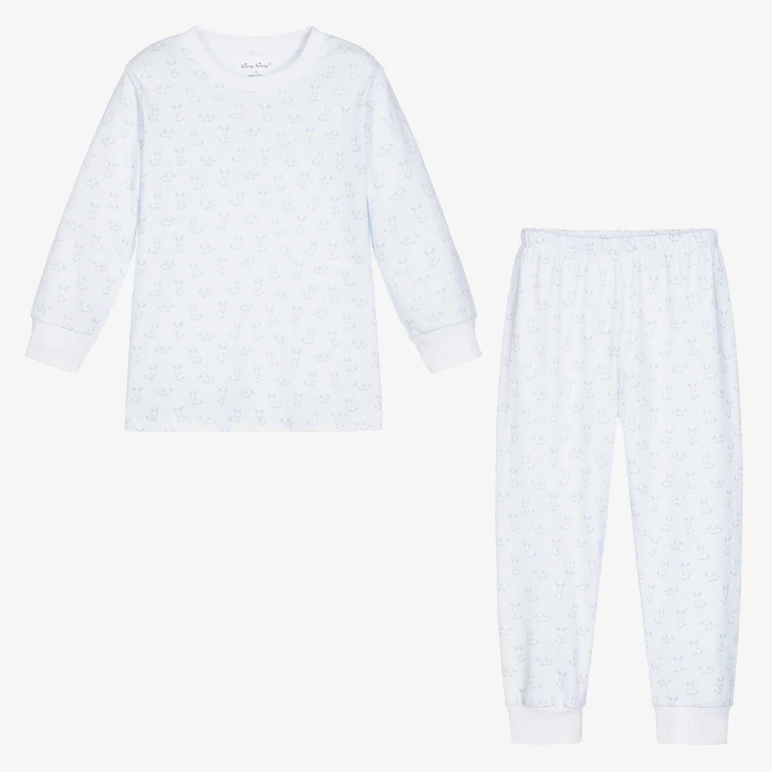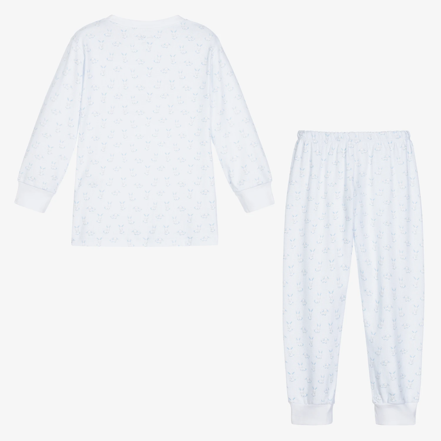 Boys blue and white long pyjamas by Kissy Kissy, made in super soft Pima cotton jersey. It has a sweet blue and white bunny rabbit print. The top has white ribbed trims and the trousers have an elasticated waistband.